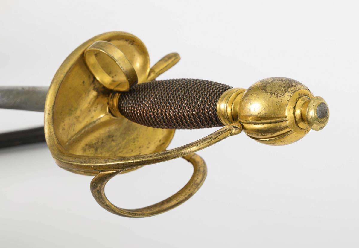 Straight, broad, double-edged blade with engravings, including a small "Turk's head". Brass hilt with heart-shaped guard plate and two clasps. Ball pommel partly ribbed. Corresponds to M 1715. Leather scabbard with hook .