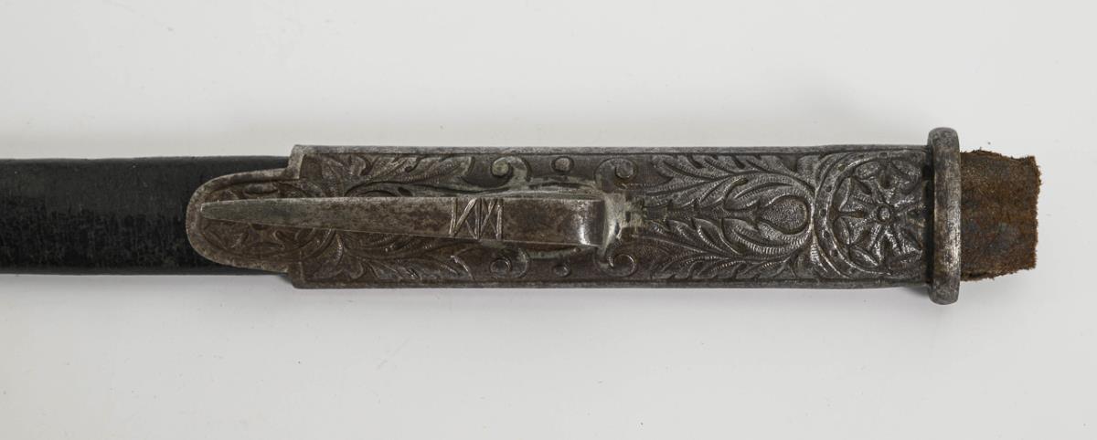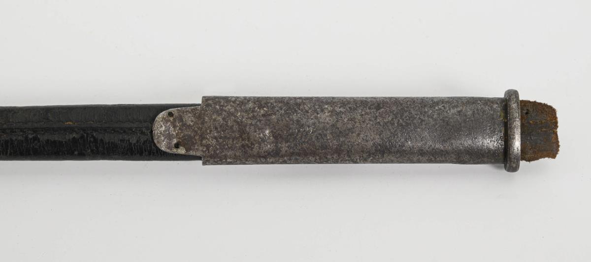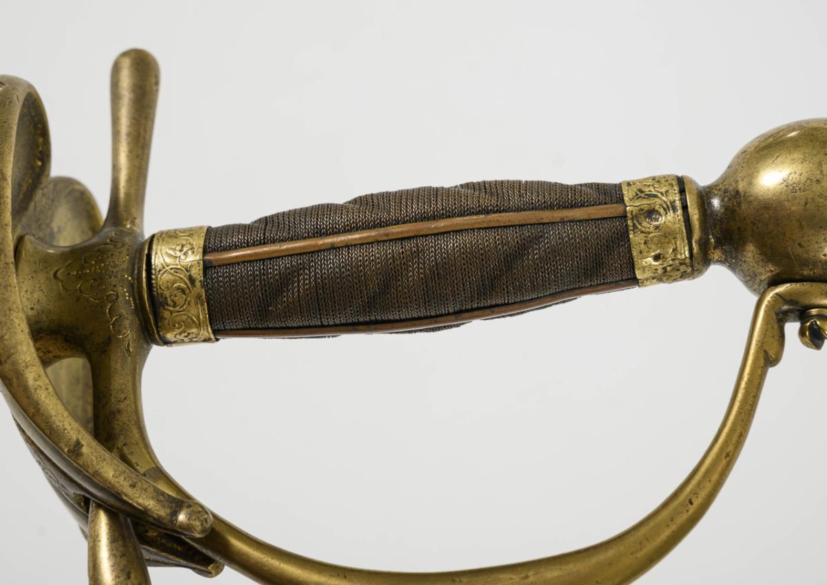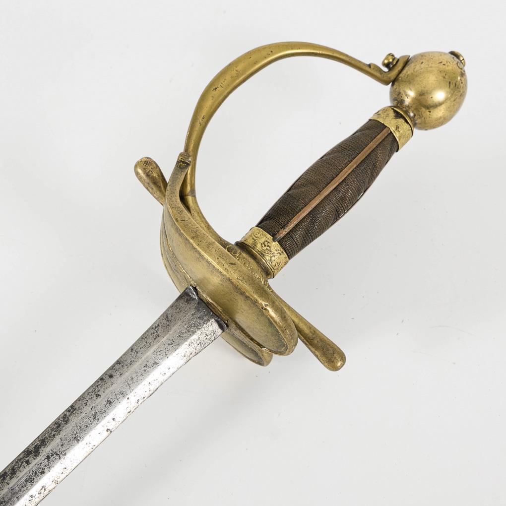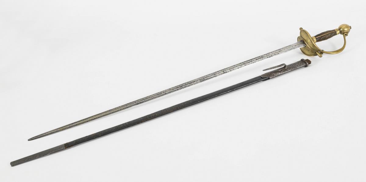 Blade hexagonal in cross-section with corrosion pitting. Lightly decorated, multi-piece brass hilt with a heart-shaped guard plate, screwed-on bow on a large ball pommel. Ribbed grip with fine wire winding and four 'longitudinal struts'. Black leather scabbard with muzzle sleeve decorated on one side and long hook.