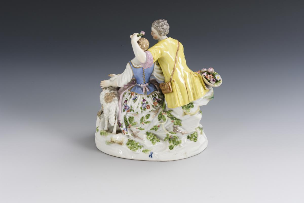 Seated, kissing young rococo couple with flower-filled hat and sheep. Stick defective, chips to flowers and leaves, right foot and right hand of the lady.