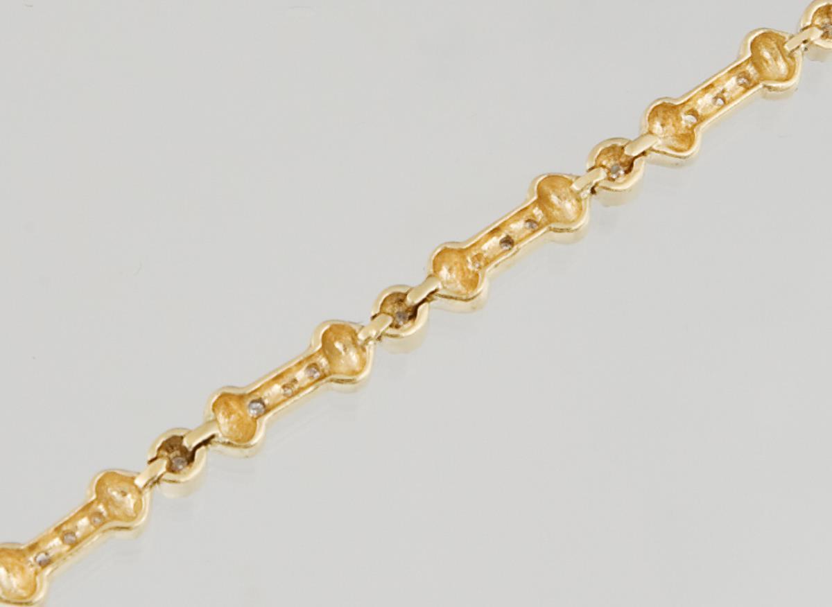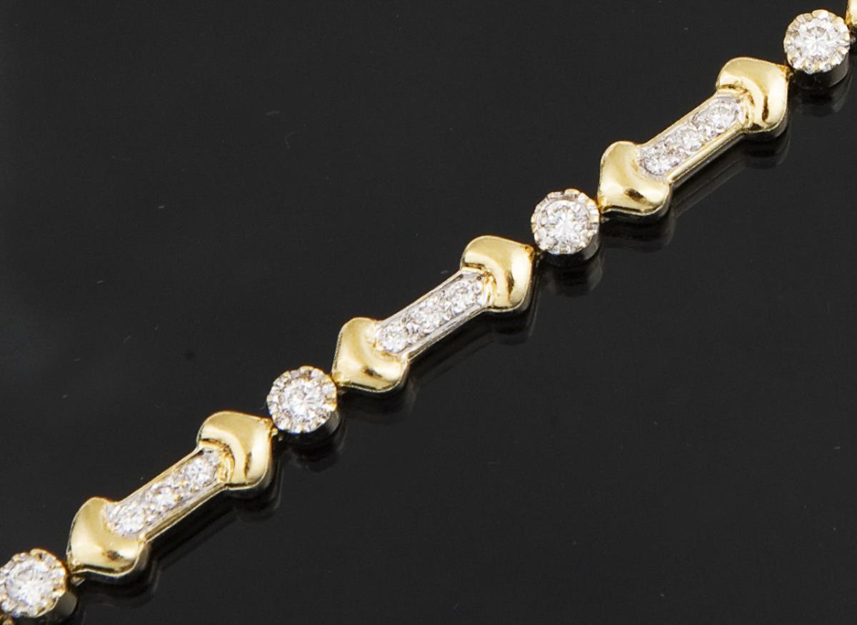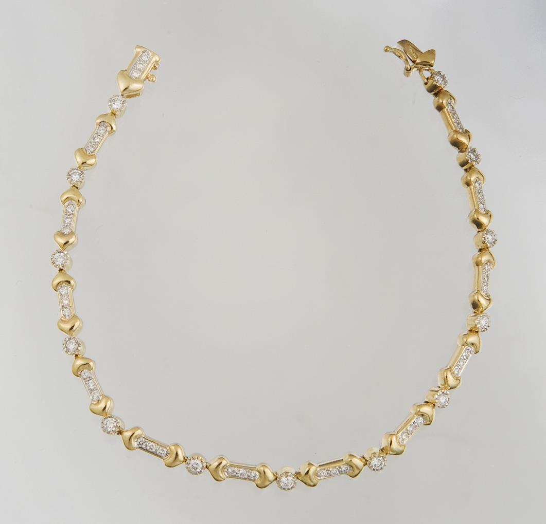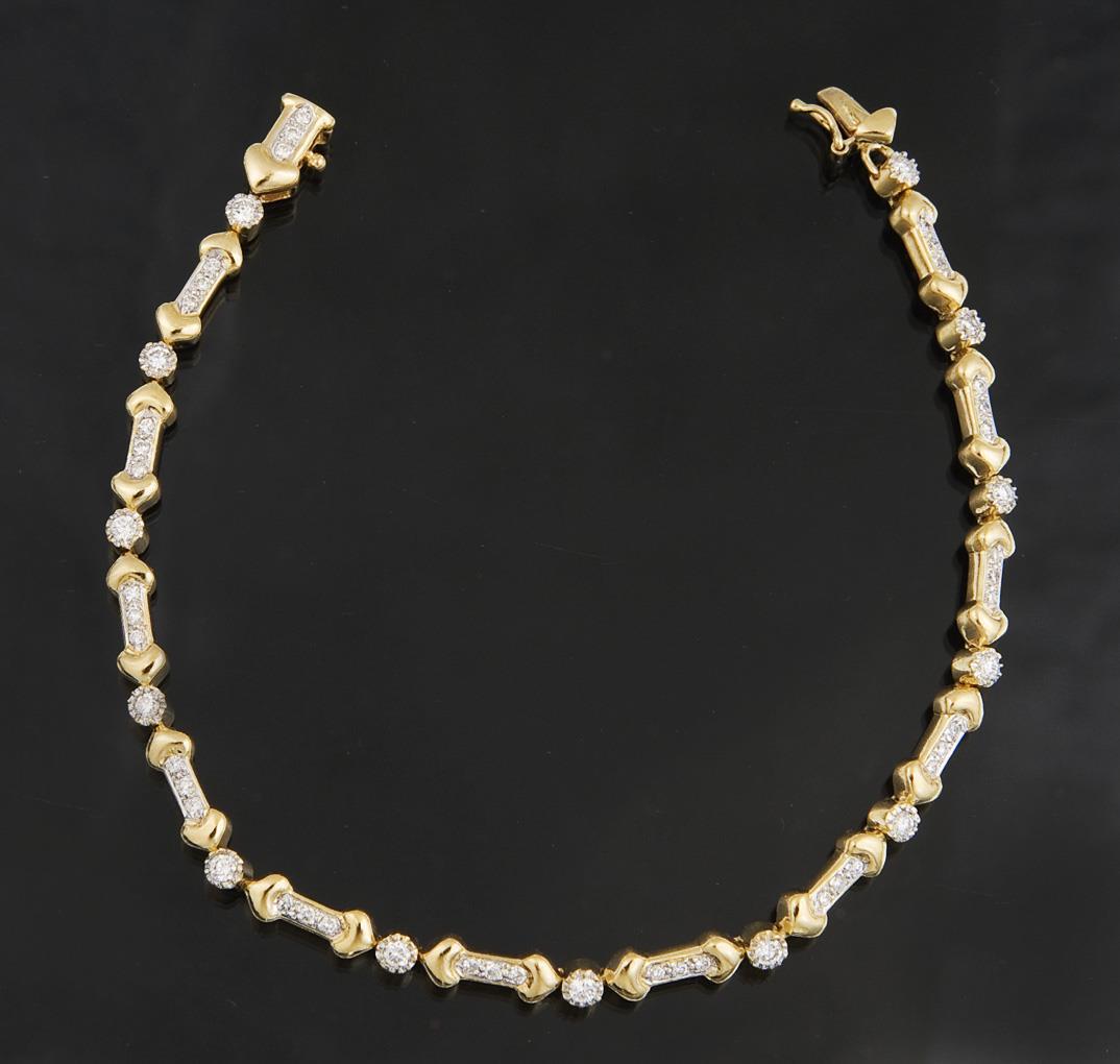 52 small diamonds in bezel setting, box clasp with eyelet. Hallmarks: Fineness, jeweler's mark.