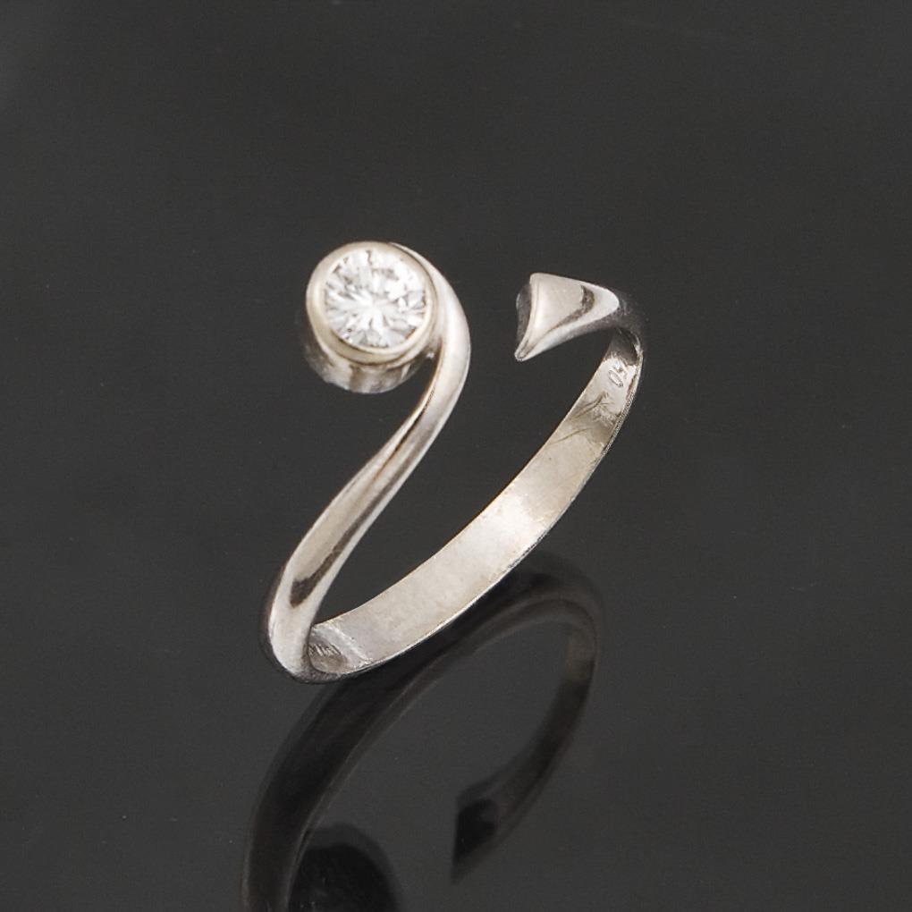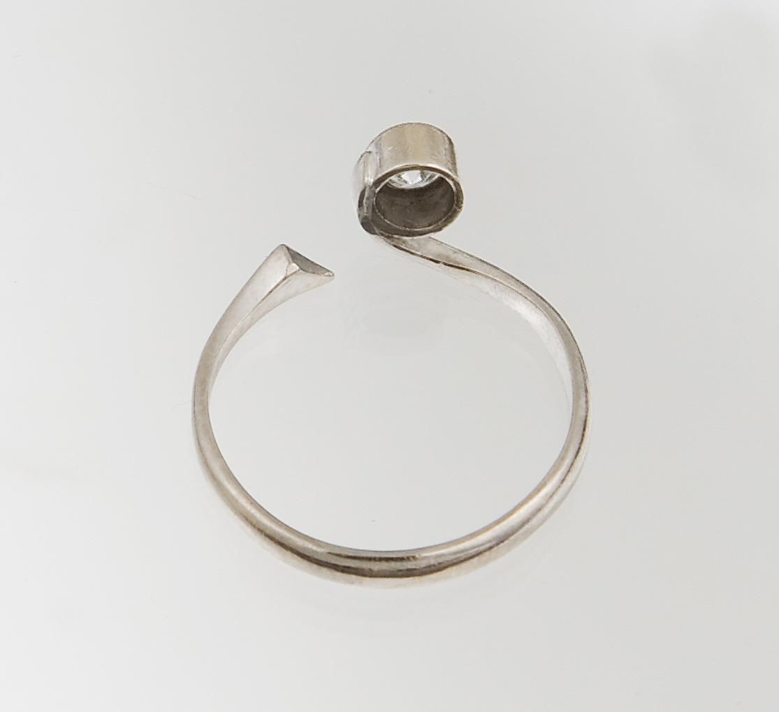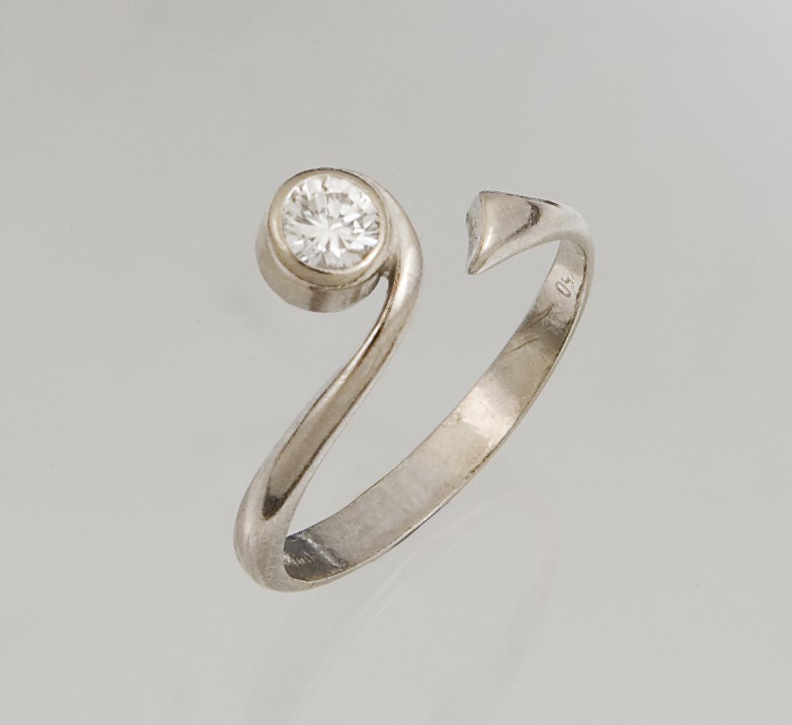 Circa 0.25 ct brilliant-cut diamond in bezel setting, modern design with open shank. Indistinct hallmarks, fineness tested with acid.
