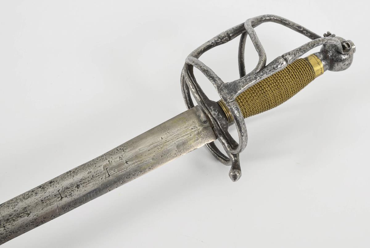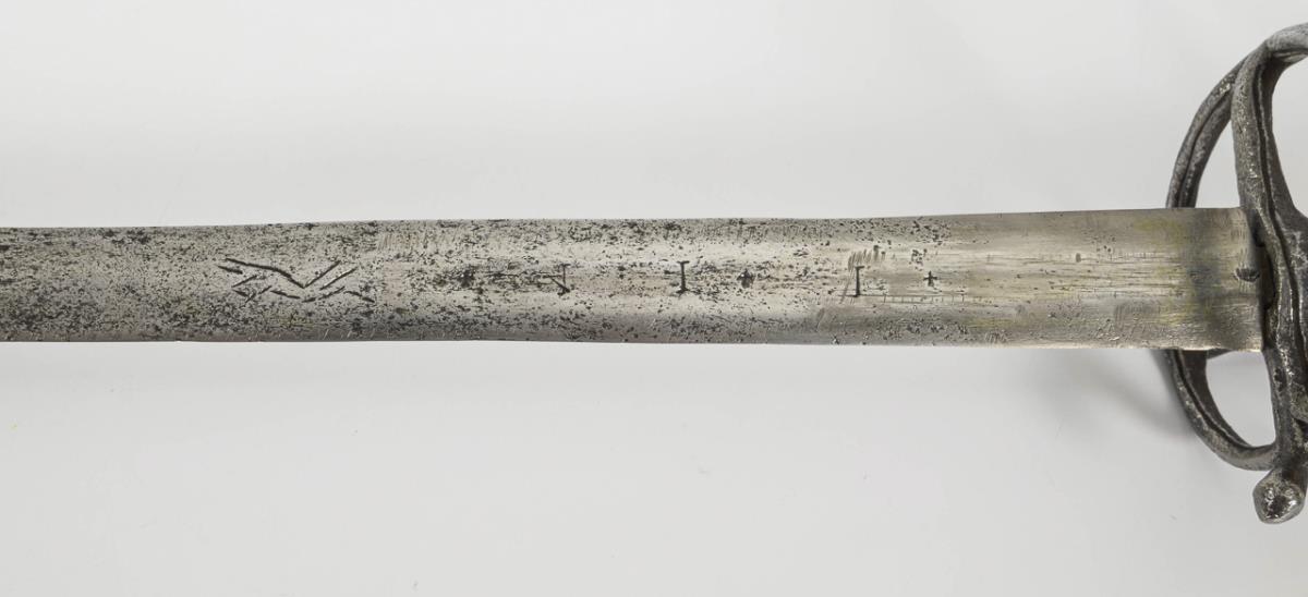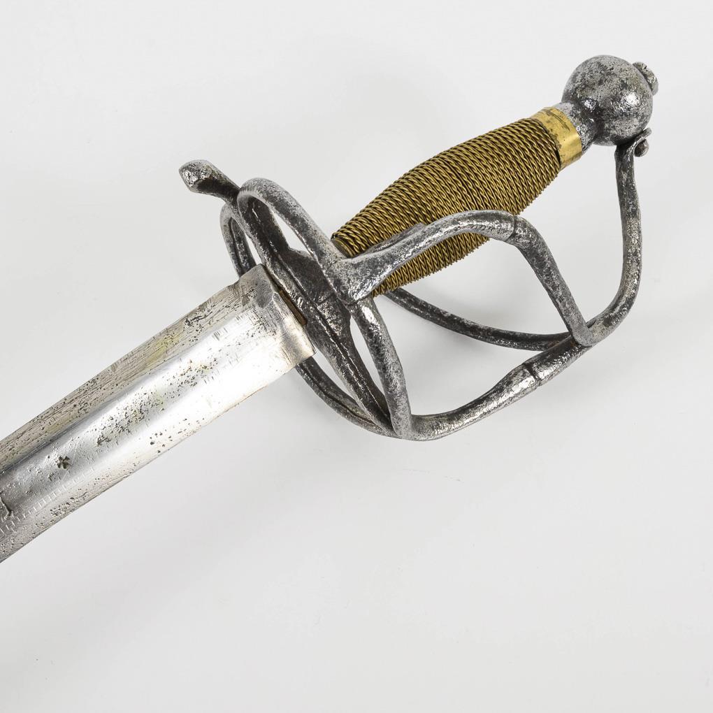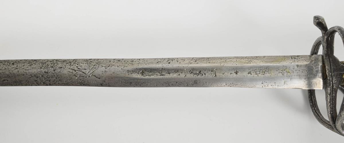 Broad, straight, double-edged blade with a short, flat hollow grind. The blade engraved with the Solingen wolf and three other marks. Four-pronged iron hilt with thumb ring, screwed twice to the ball pommel. Wire winding probably younger. Leather scabbard, probably with a broken hook.