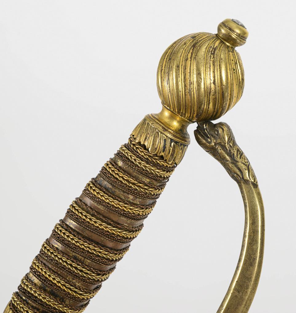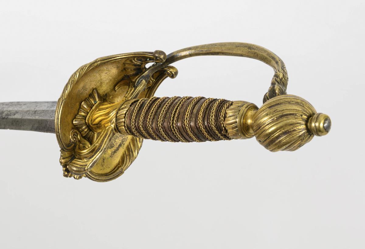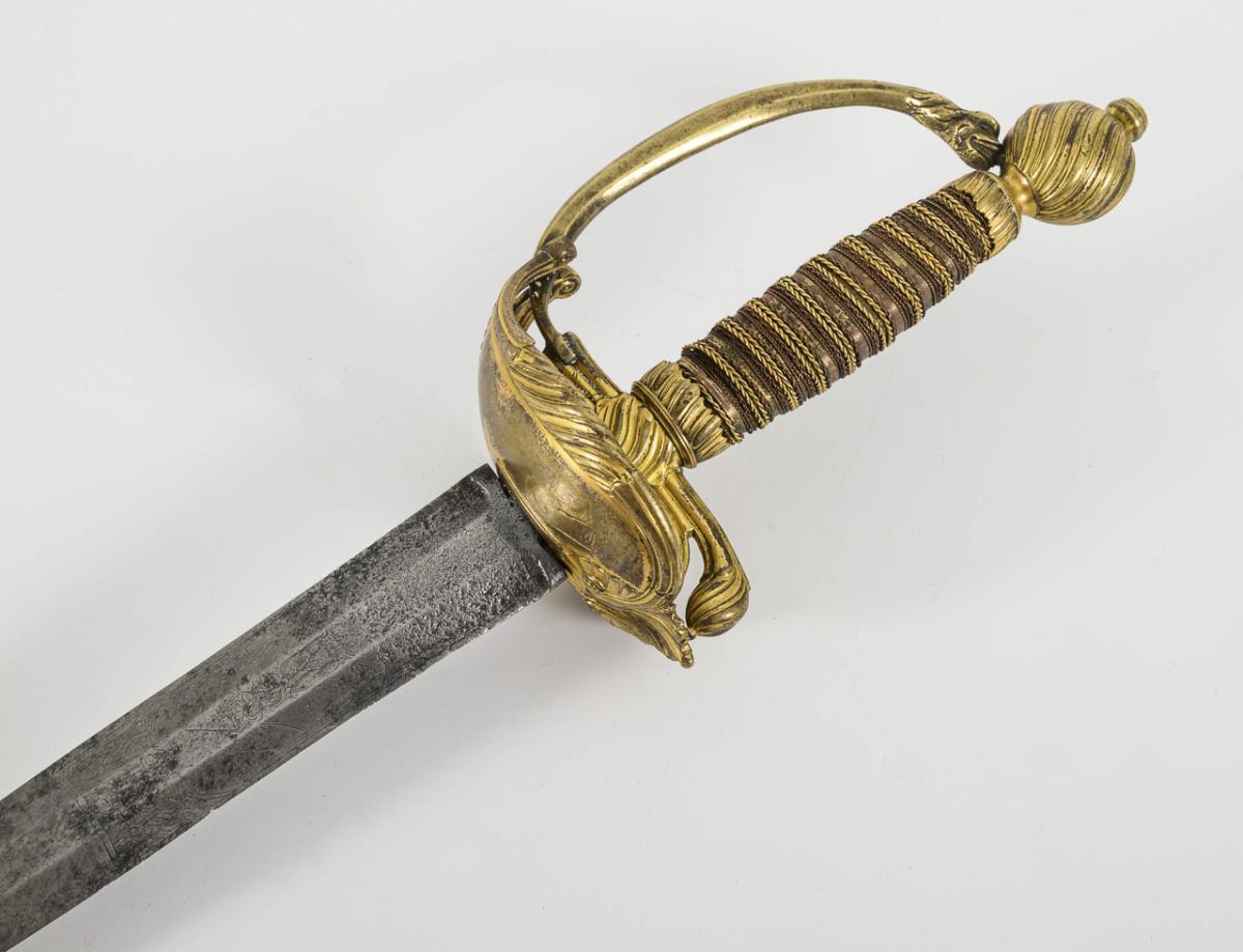 Straight, double-edged, conical blade with hexagonal cross-section. With engraved pattern (knight with sword), some corrosion pits. Brass hilt with remnants of gilding. Grip with different wire and ribbon winding. Black leather scabbard with hook.