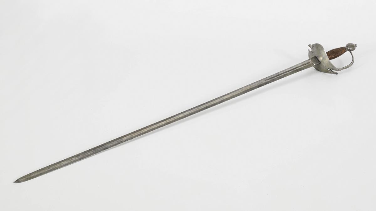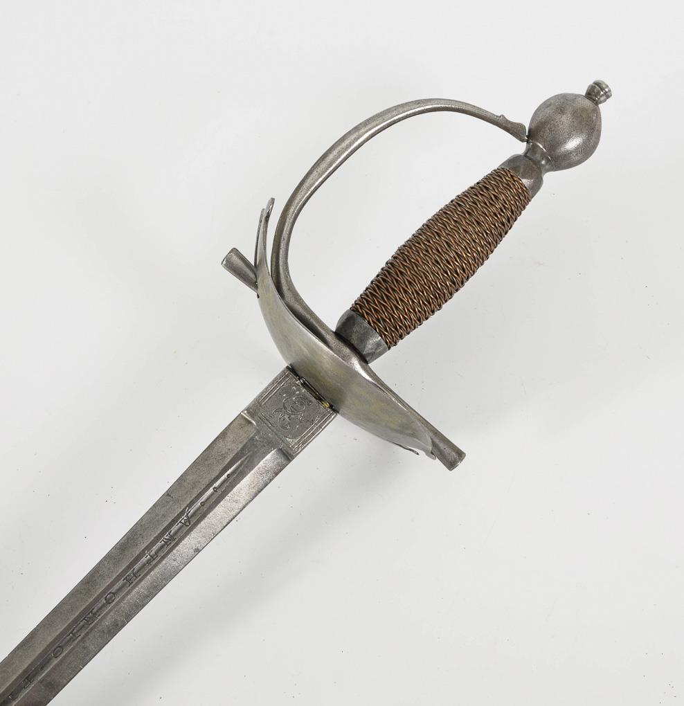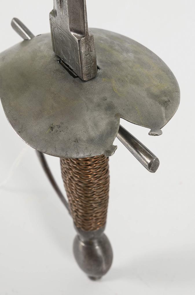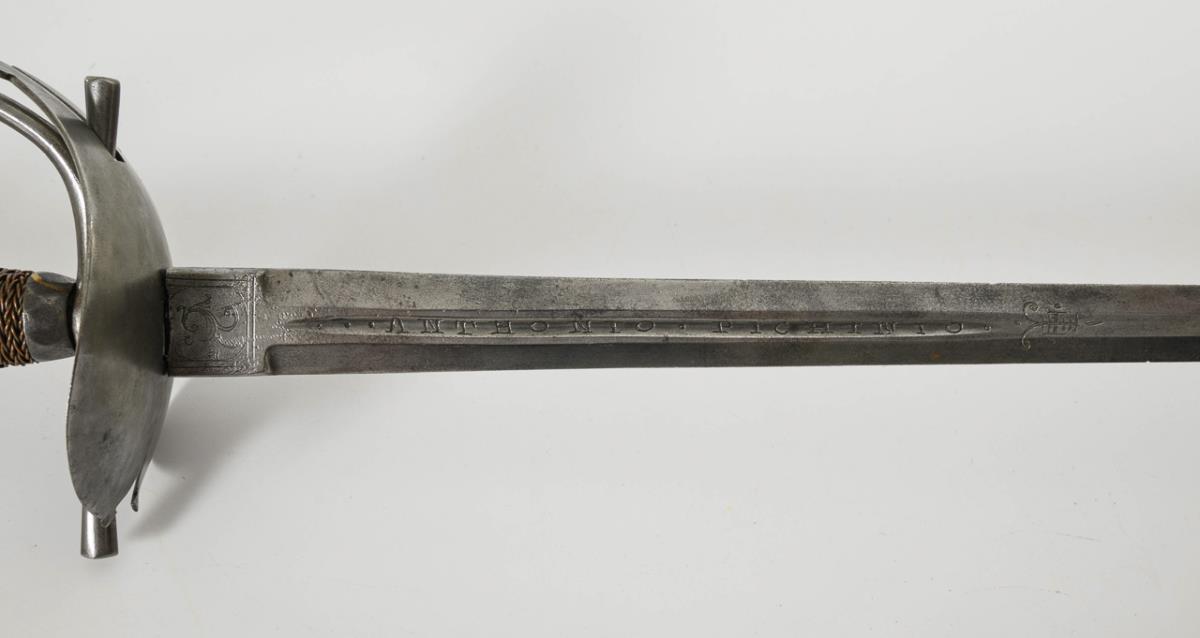 Old, double-edged blade with a narrow fuller, stamped "Anthonio Pichinio". Some material removed at the transition from ricasso to tang to match the younger iron hilt, blade chipped. Heart-shaped guard plate with broken end. Copper wire winding.