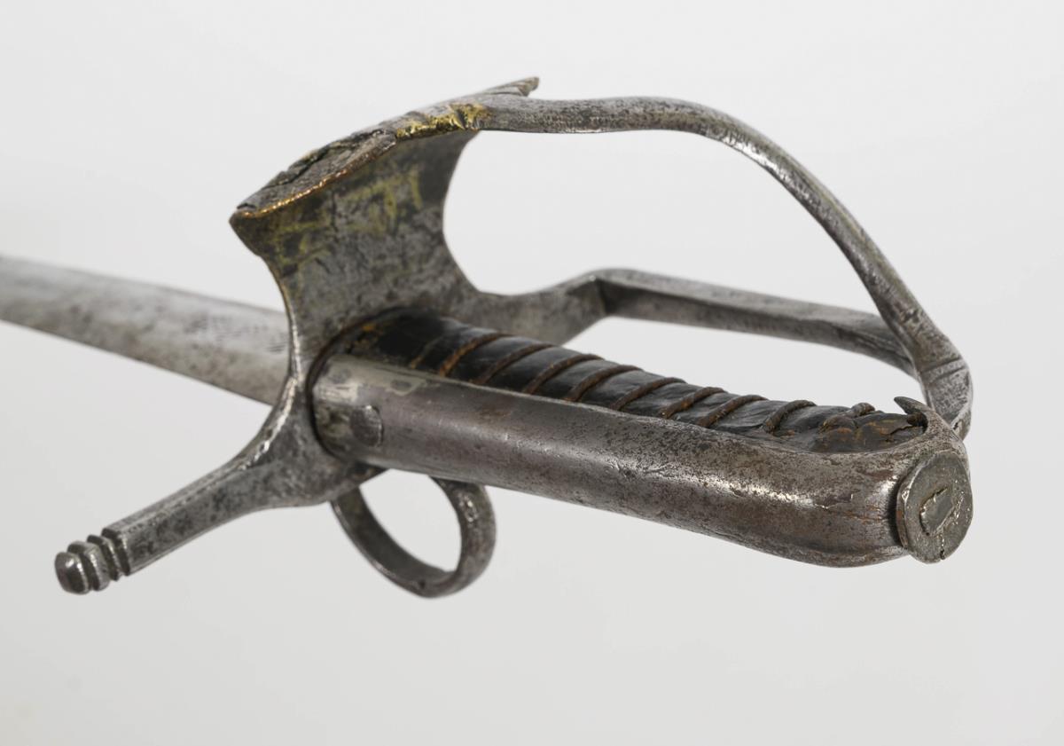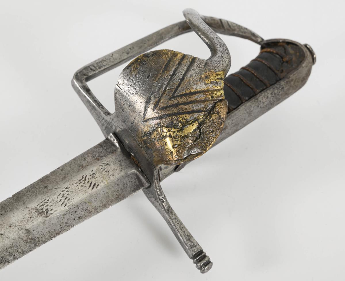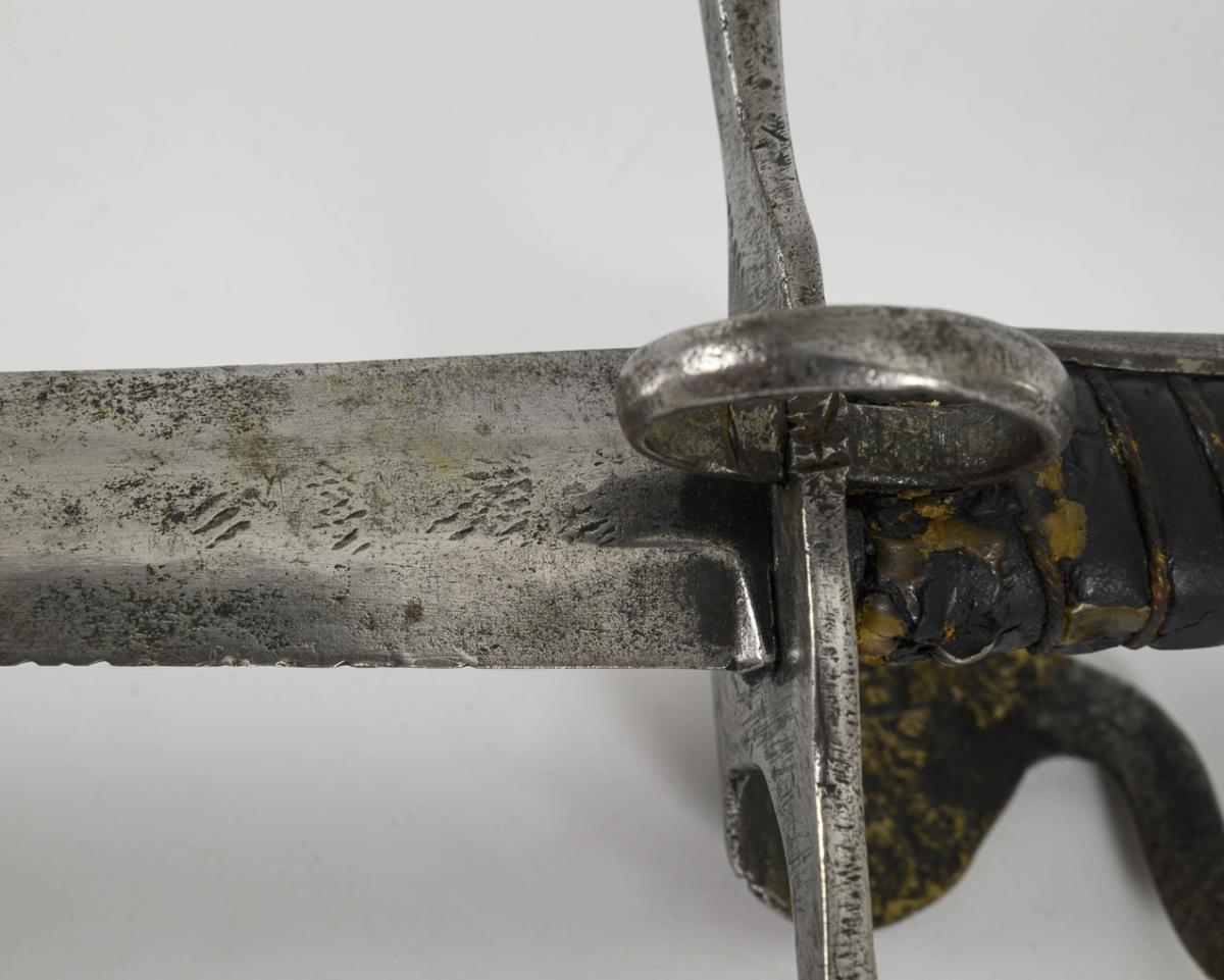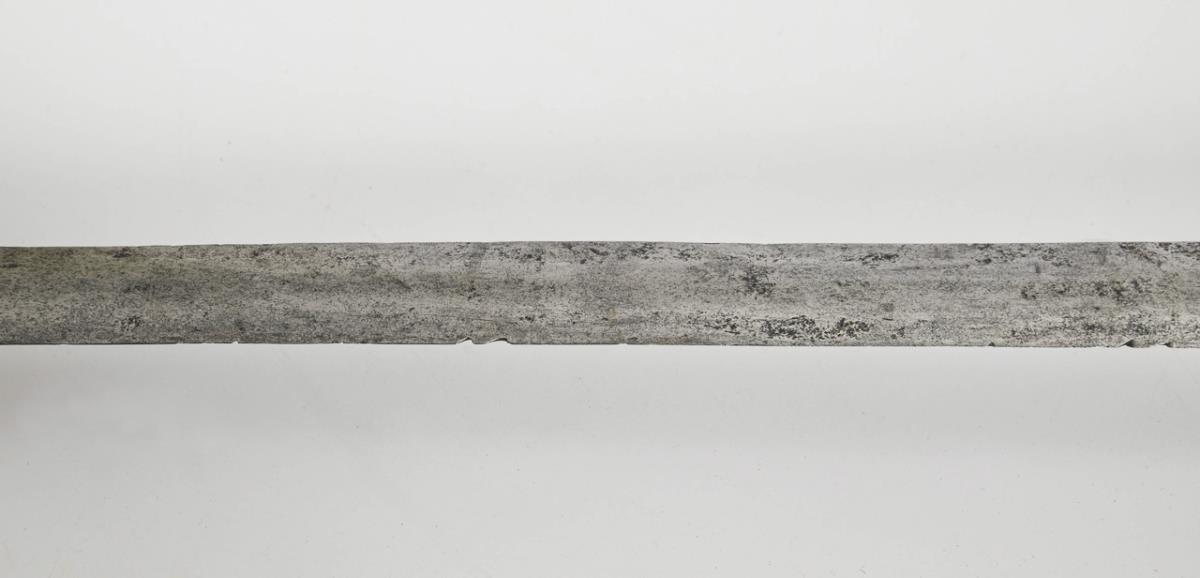 Broad, double-edged blade with lenticular cross-section, somewhat chiselled. Iron hilt with thumb ring. Repair to the curved guard plate. Grip with leather cover and wire winding. Various alterations have been made.