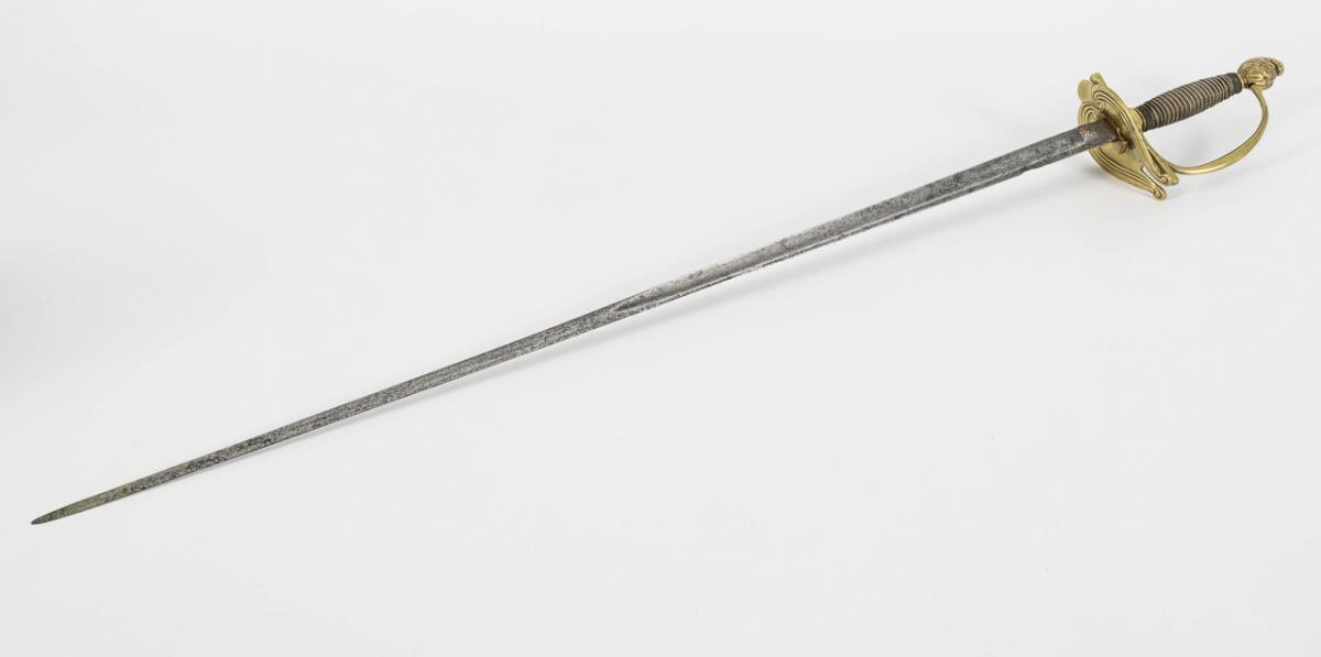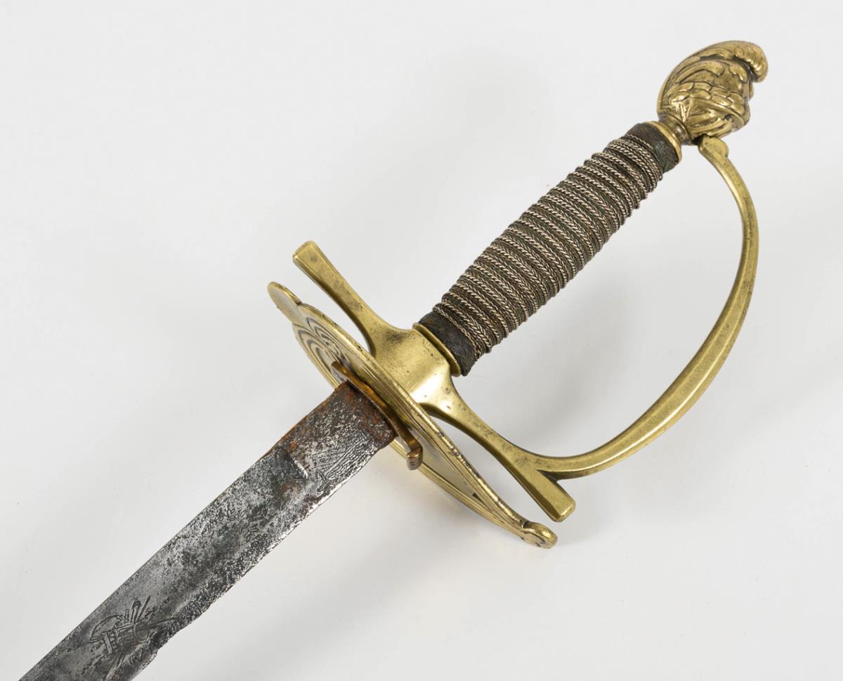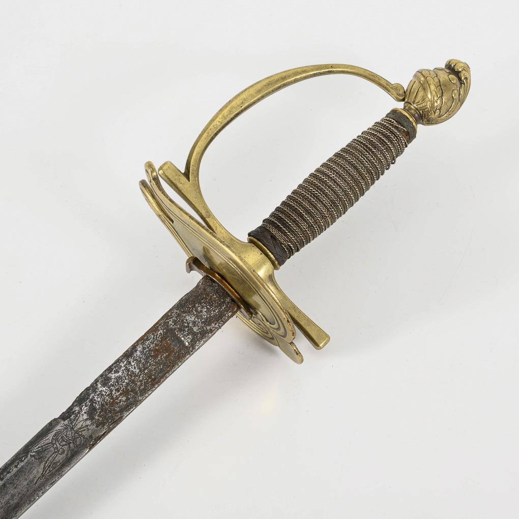 Straight, single-edged blade with a broad fuller extending over the middle, broad back, some pattern engravings. Blade with heavy traces of corrosion at the base. Asymmetrical, heart-shaped guard plate, straight quillons and simple knucklebow. Pommel as a crest. Grip with wire winding.