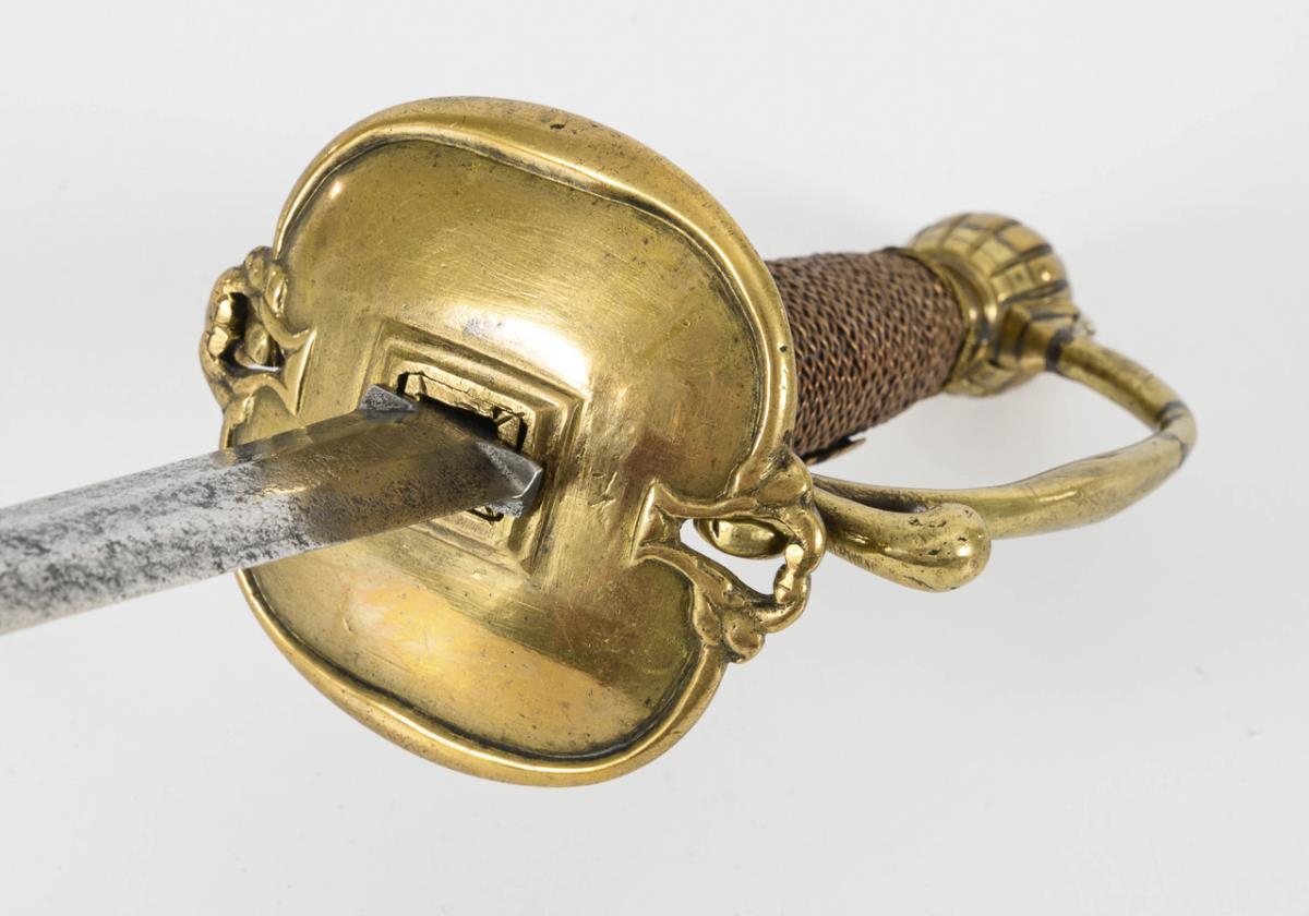 Straight, double-edged blade with hexagonal cross-section. Brass hilt with ribbed decoration, on the probably younger wire winding of the grip a double-headed eagle emblem. Repair marks on the hilt, blade with faint corrosion pits.