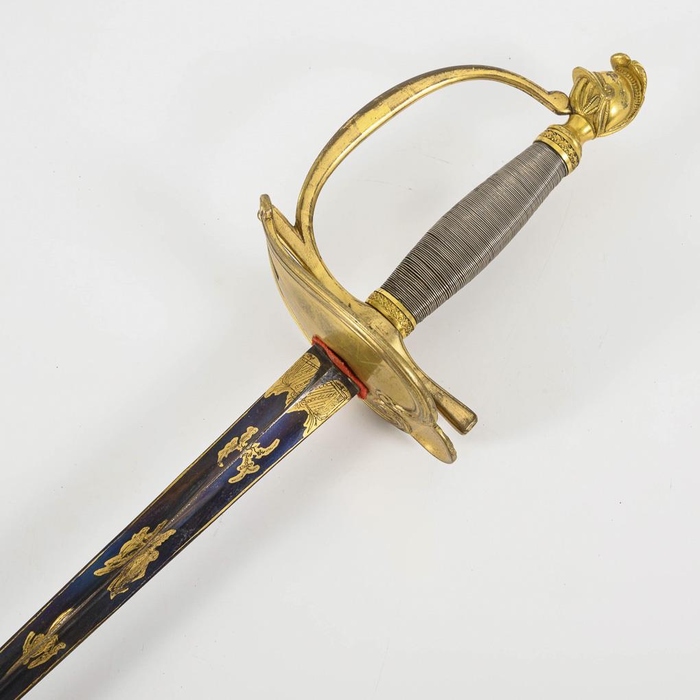 Triangular blade with gilt engravings on bluing. Gilt hilt, with asymmetrical, heart-shaped guard plate and shell finial, grip with later, supplemented wire winding, helmet pommel. Black leather scabbard, heavily rubbed, quillons missing.