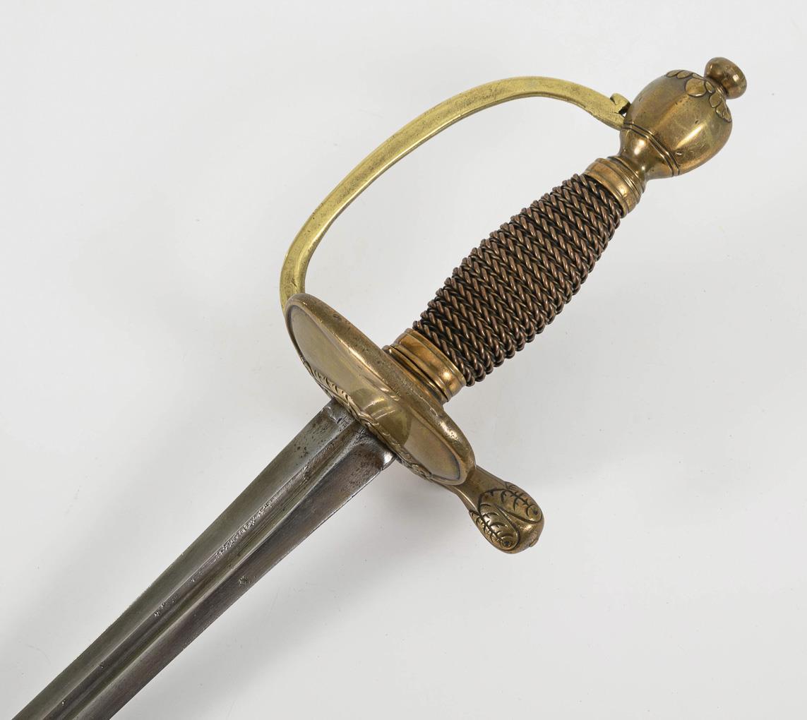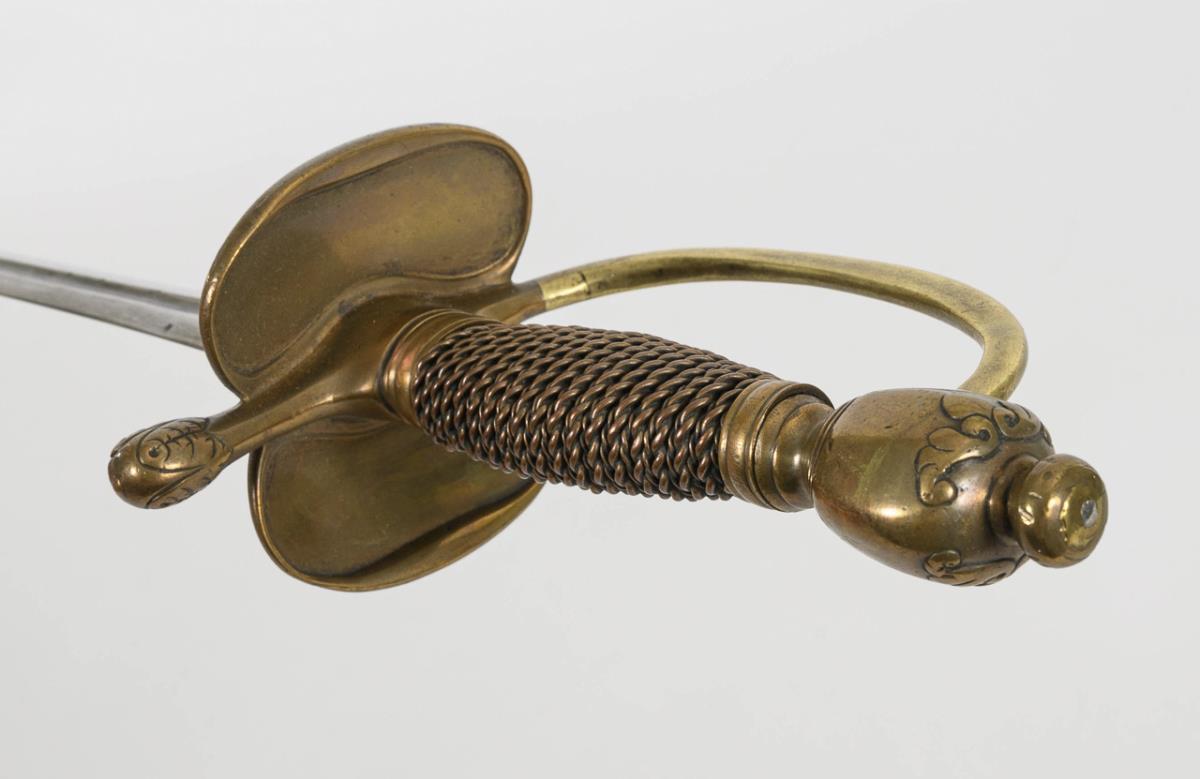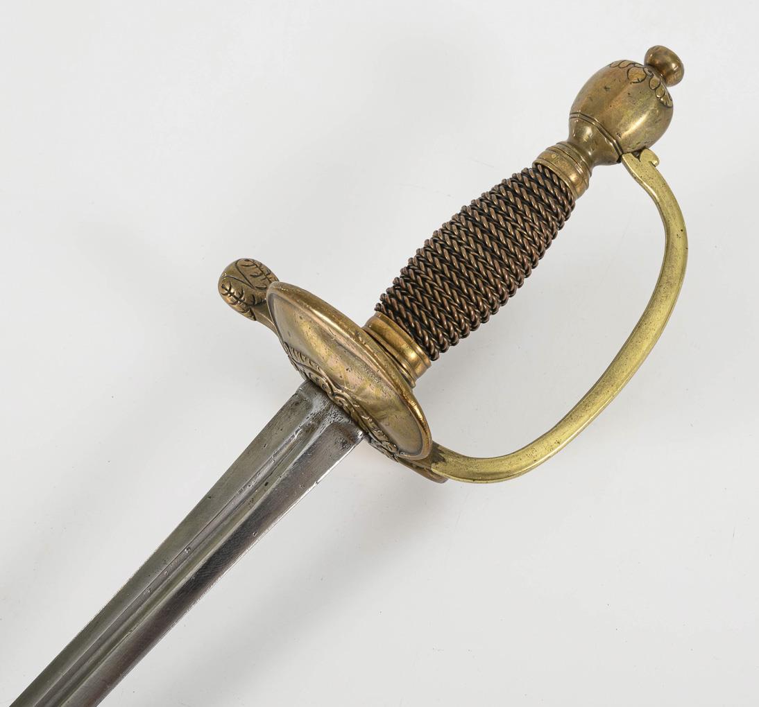 Double-edged blade with narrow fuller, brass hilt. Replaced leather scabbard with muzzle plate, several holes there, crease in the scabbard.