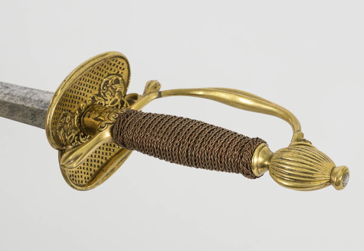 Straight, double-edged blade, becoming narrower after the first quarter. Brass hilt with kidney-shaped, pierced guard plate. Wire winding probably added more recently. Conserved corrosion pitting.