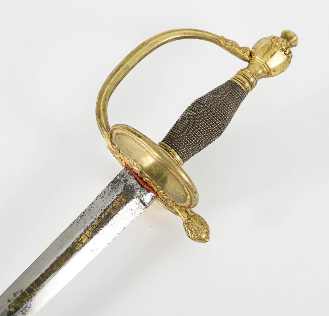 Straight, double-edged blade with hexagonal cross-section, slightly rounded point. Gilt inscription "Pro Gloria et Patria" on both sides of the central ridge.