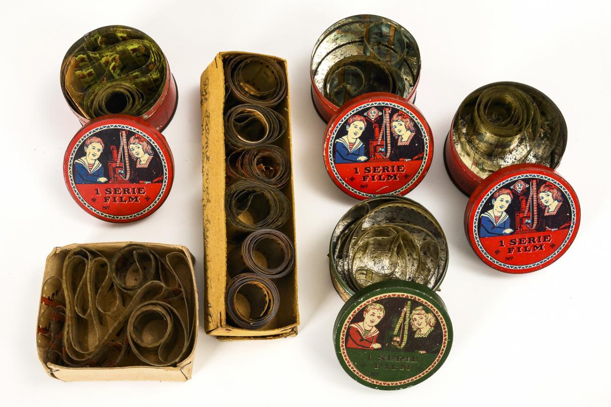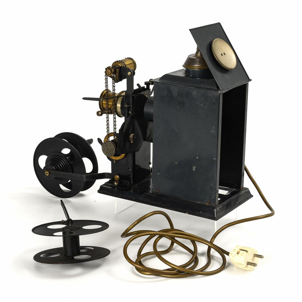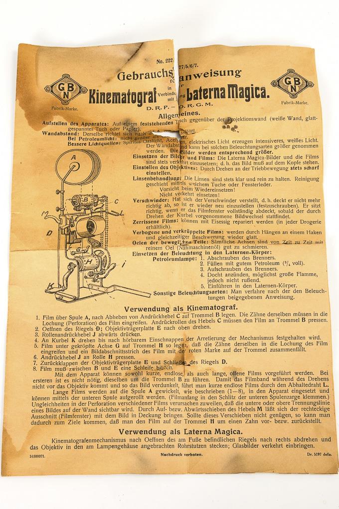 "Kinematograf in connection with Laterna Magica, No. 222/77/5/6/7". Comes with original instruction manual, some film material and 4 original tin film cans. Younger electrified, function not tested.