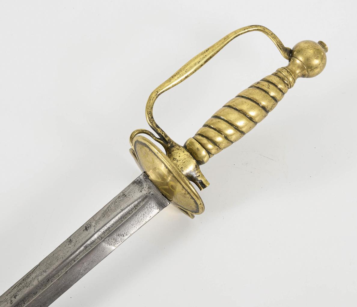 Broad, double-edged blade with a short fuller. Blade marked with the remnants of a similar-looking wolf mark with the letter "H" in the wolf. Brass hilt and gadrooned grip. Part of the quillons and a finger grip missing.