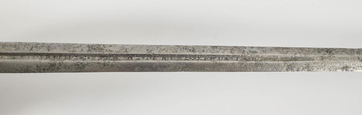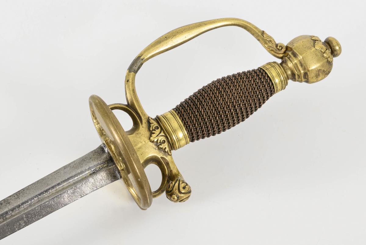 Straight, double-edged blade with a narrow fuller in the lower third, stamped "FREDERICH", somewhat polished. Brass hilt with kidney-shaped guard plate, two finger grips. Crossguard and curved quillons with an inconspicuous crack or repair mark. Polygonal pommel.
