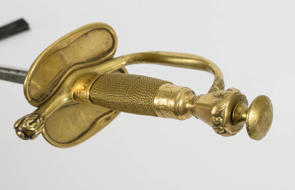 Old-style IOD with an older blade. This straight, double-edged, hexagonal in cross-section, stamped "ENGEL" and "TESCHE" in the short central hollow. Brass grip with probably renewed wire winding. Brown leather scabbard with traces of age. Soldered spot at the transition from the knuckle-bow to the pommel, another drilled hole in the pommel, missing muzzle plate on the scabbard.