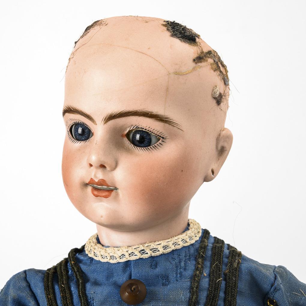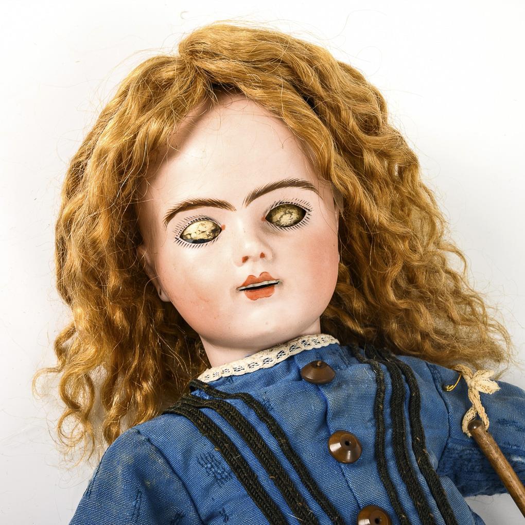 Crank head, blue sleeping eyes, feathered eyebrows, earlobes, original red-blonde curly wig. 7-piece walking doll body with kissing hand and intact voice that sounds with every step. Old blue dress with black trim, old black shoes, light-colored hood. Hairline spider on forehead, eyes somewhat deep-set. Body rubbed, hands probably reworked.