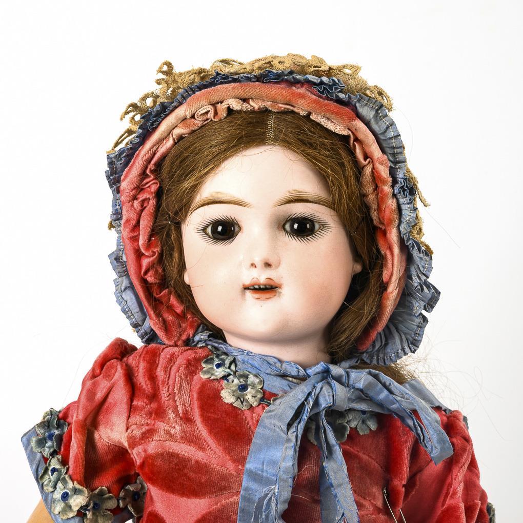 Cranked head, brown glass eyes, pierced ears, brown real hair wig with cork lid. French stiff-jointed body. Defective salmon-colored dress with ruffles, matching hood, old black shoes, pearl bag. Hairline tear on the right temple, fingertips bumped.