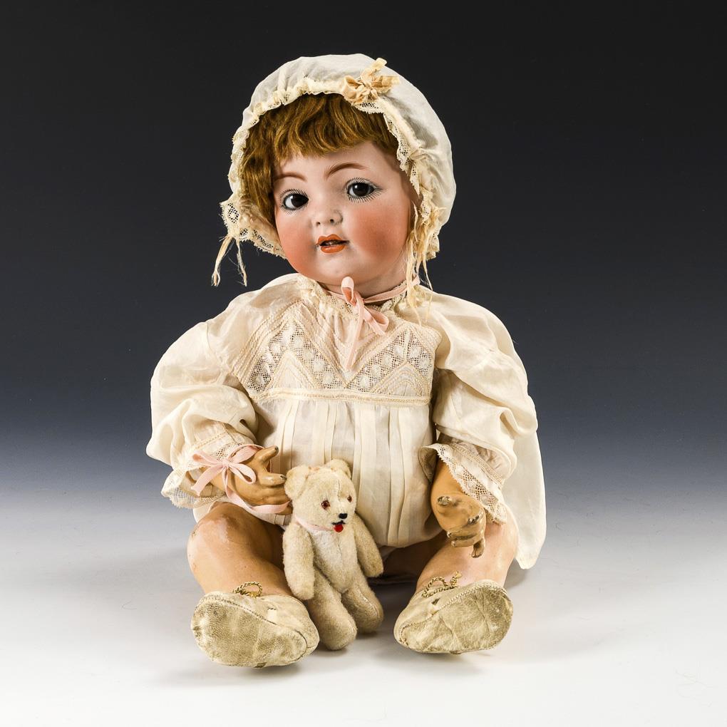 Cranked head, brown sleep/smile eyes, open nostrils, tongue, dark blond mohair wig. 5-part sitting baby body. Old delicate baby clothes made of light silk batiste, matching bonnet, small teddy on the wrist. Head x-rayed: without cracks, only small chip on the crown of the head. Arms painted over.