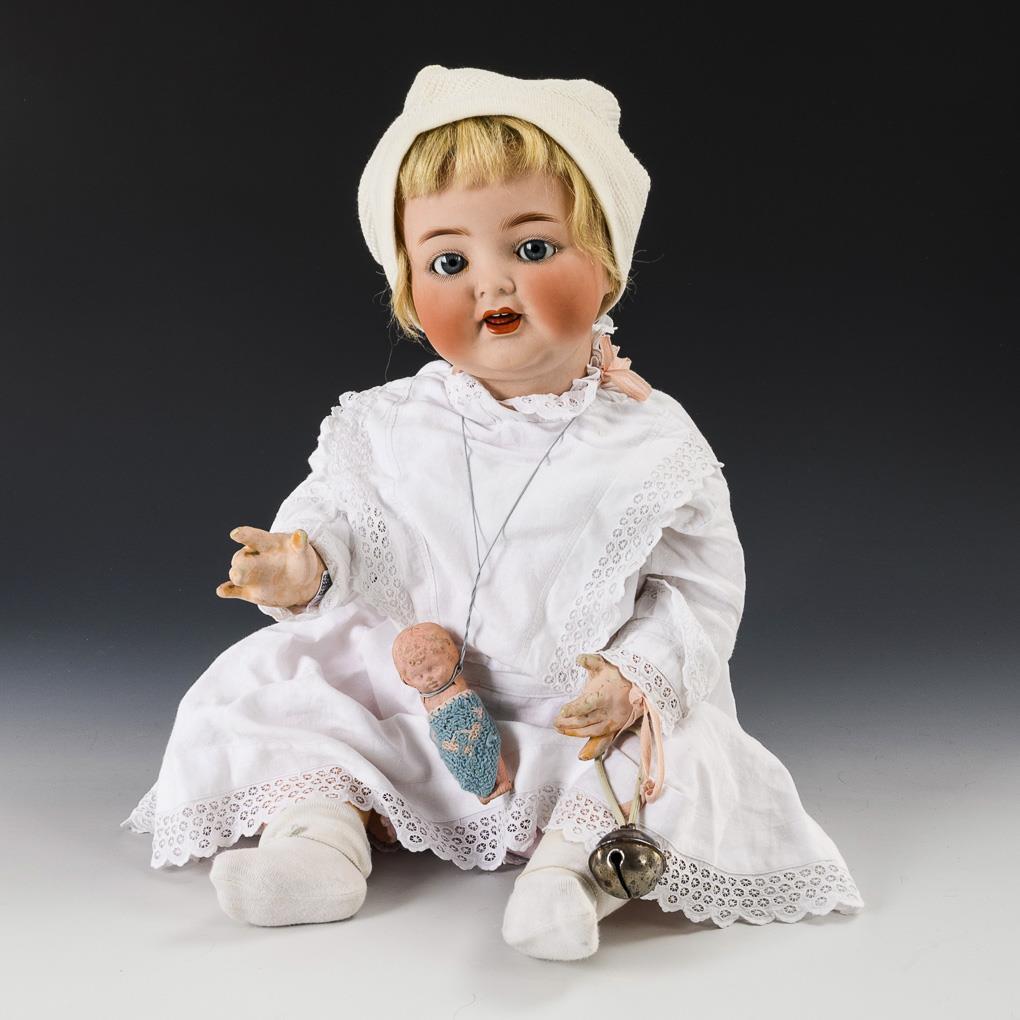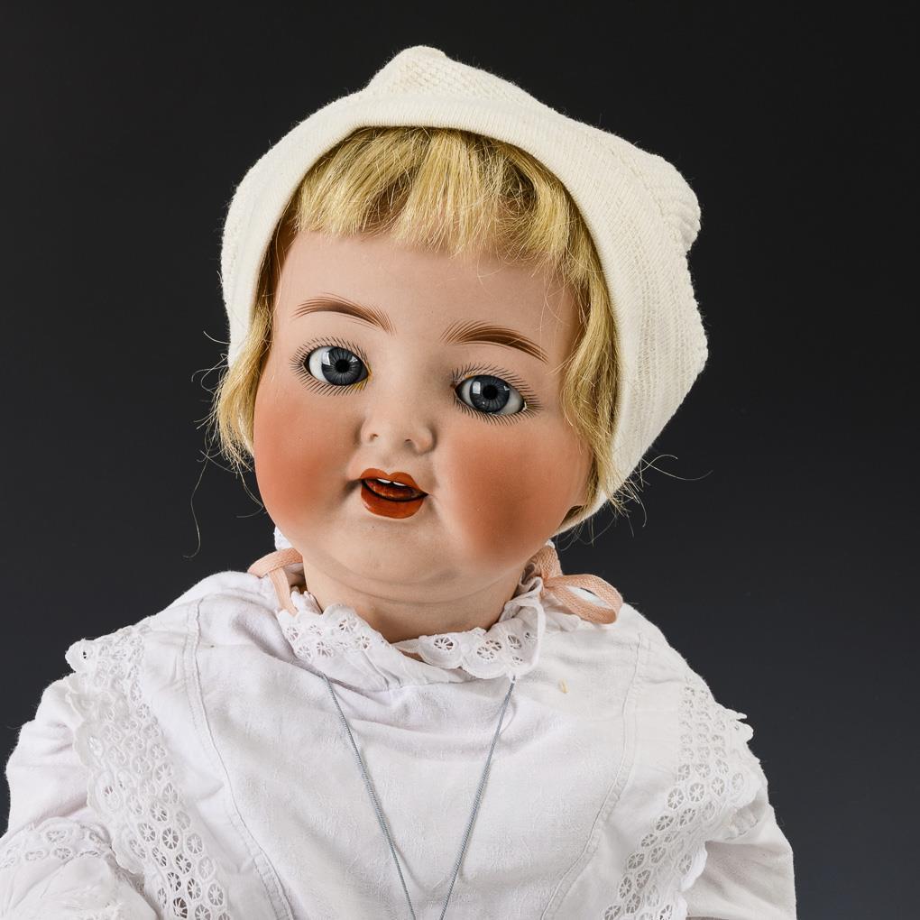 Cranked head, blue sleeping eyes, movable tongue, blonde real hair wig. 5-part sitting baby body. White clothing, white cap. Comes with baby rattle and small cardboard doll. Small chip at the corner of the left eye, right eye defective on the inside (not visible from the outside). Body with cracks at the base of the neck, hands rubbed.