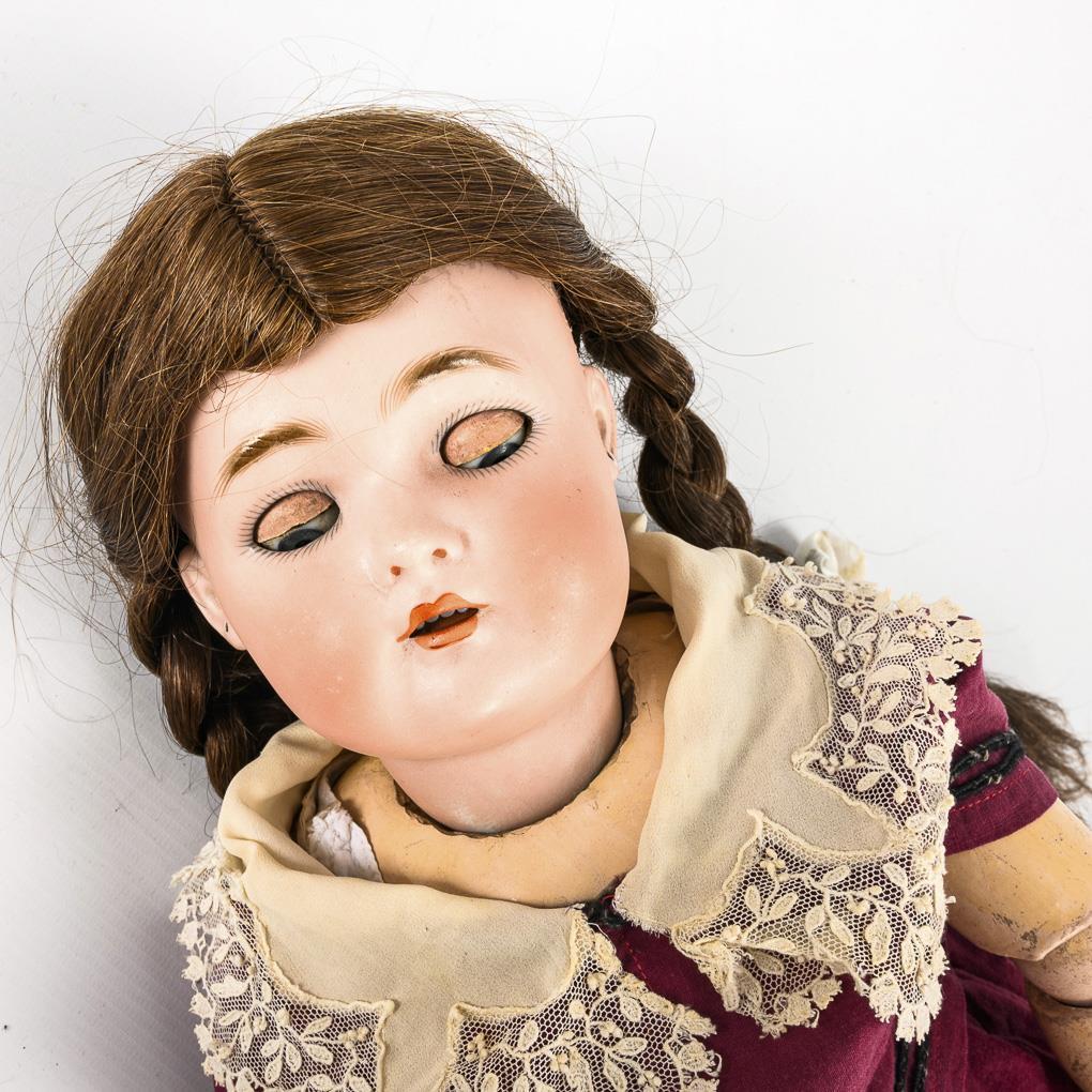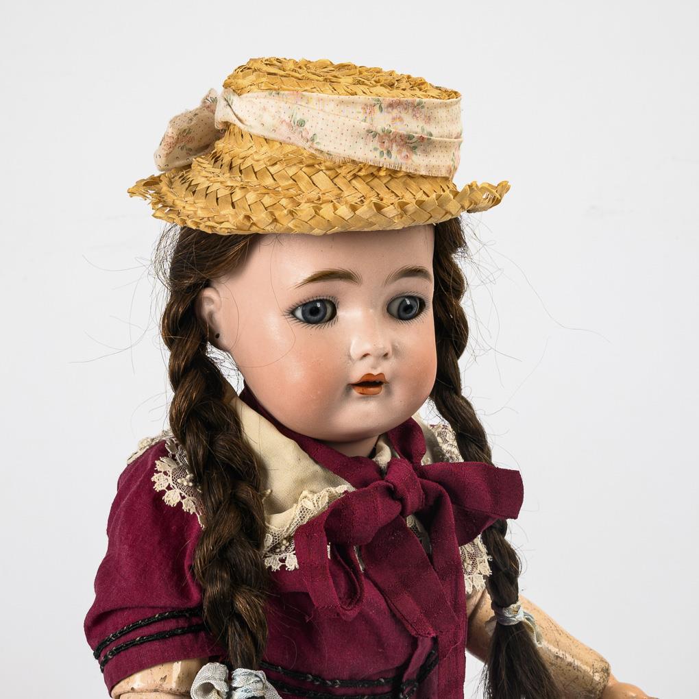 Cranked head, blue sleeping eyes, pierced ears, brown real hair wig. 15-piece articulated body. Wine-red dress with white lace collar, straw hat, brown shoes. Head x-rayed: without defects. Body with small color defects, slightly dented in the shoulder area due to tight tension, right foot repaired.