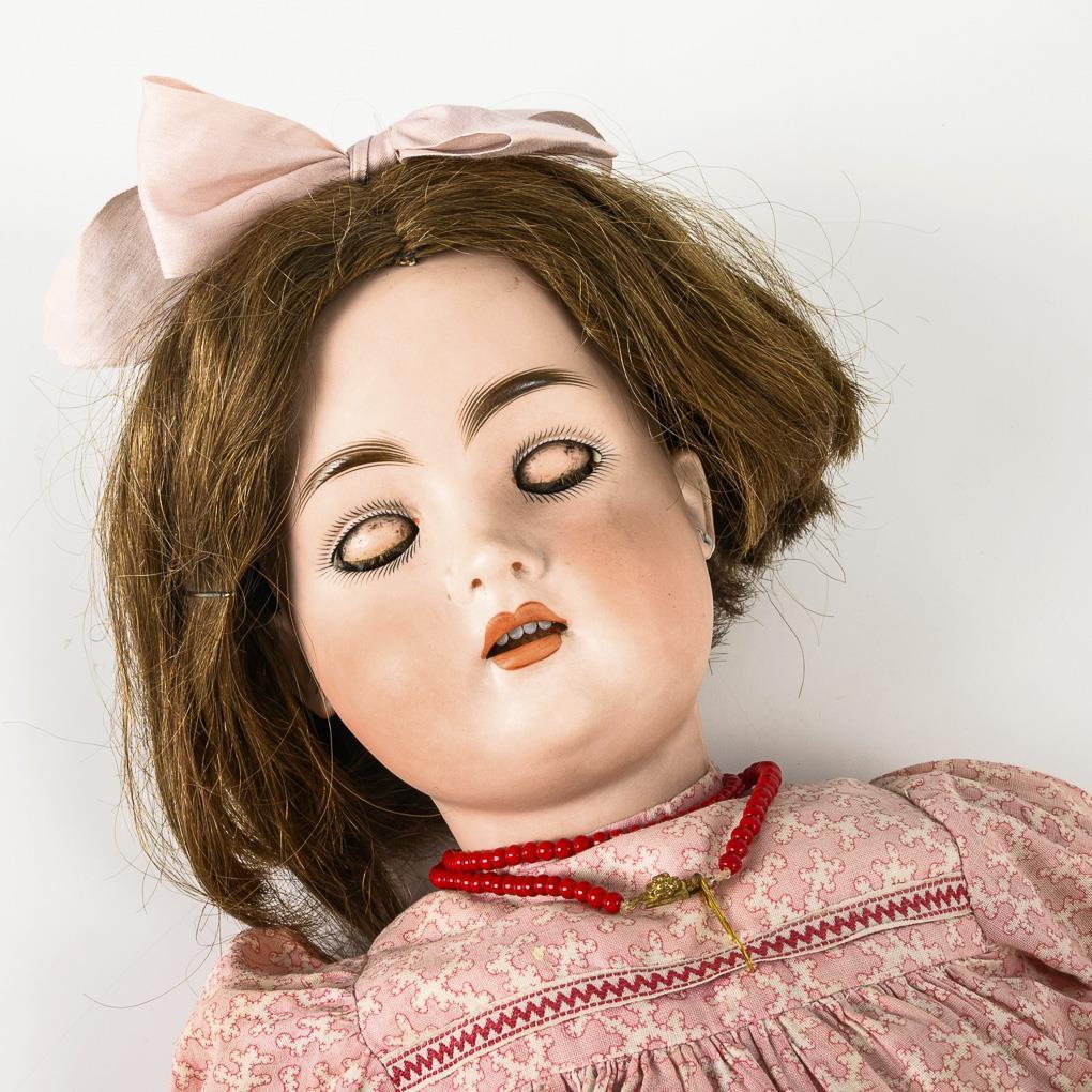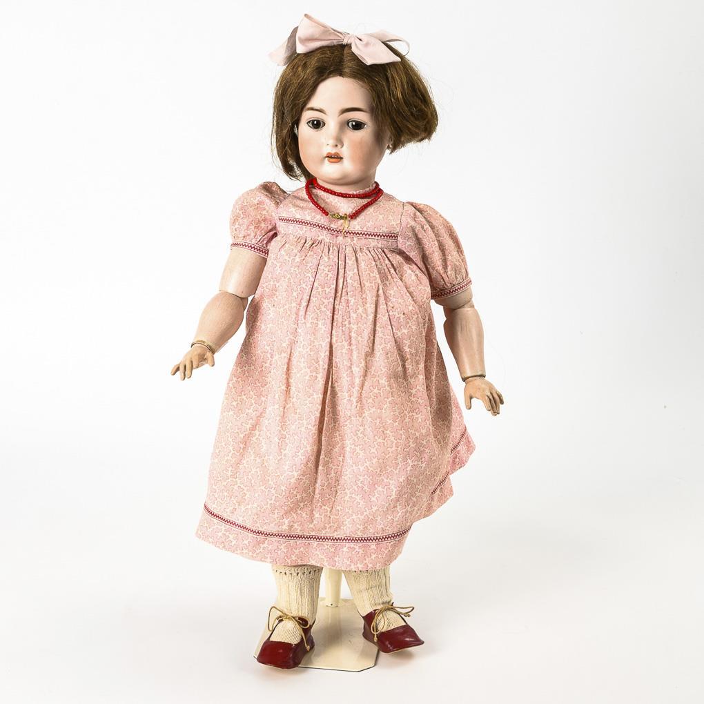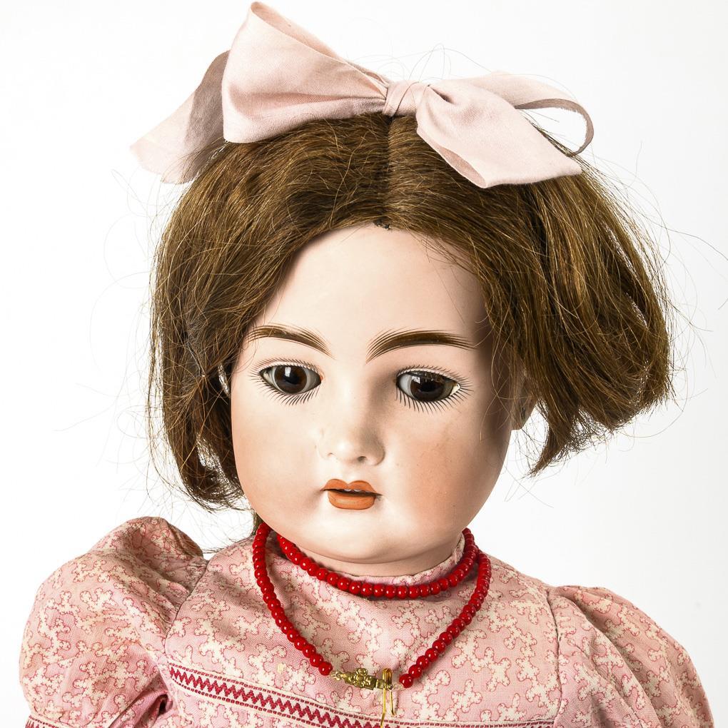 Cranked head, brown sleeping eyes, pierced ears, brown real hair wig. 13-part articulated body with spiral spring tension. Patterned dress, pink hair bow, wine-red shoes. Head x-rayed: no cracks, only chips on left earlobe. Several fingers repaired.