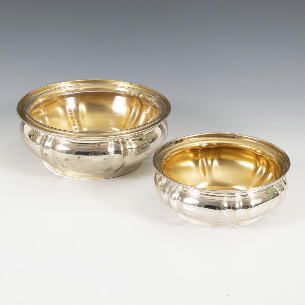 Godronized shape, gold-plated inside. 1x with added glass insert. Signs of wear.