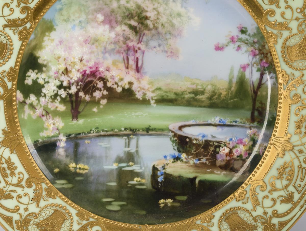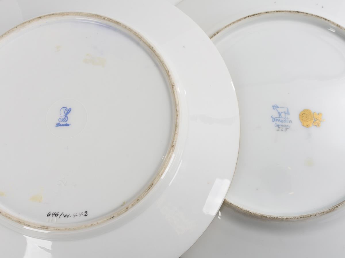 Both with splendid, ornamental gold-painted flag in relief. 1x Potschappel, signed "Flow": the mirror depicts a bouquet of flowers with insects. / 1x Lamm/Dresden: the mirror depicts a blossoming park landscape with fountain and pond. 1 plate with 3 small losses; 1 plate with 1 small loss (on the rim in the gold painting).