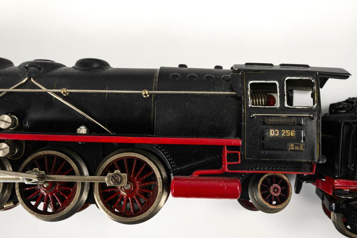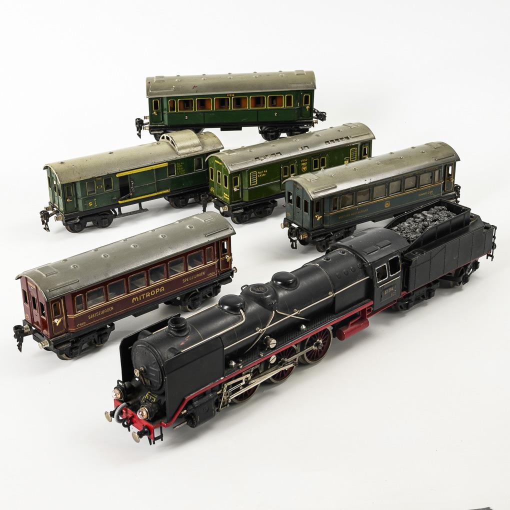 0 Gauge. For electric operation. Black locomotive "03 256" made of cast iron (2C1) with tender. Also 2 green freight cars, 1 Mitropa dining car with equipment, 1 passenger car and 1 dining car "Voiture Restaurant - Dining-Car". Worn, slight signs of age, function not tested.
