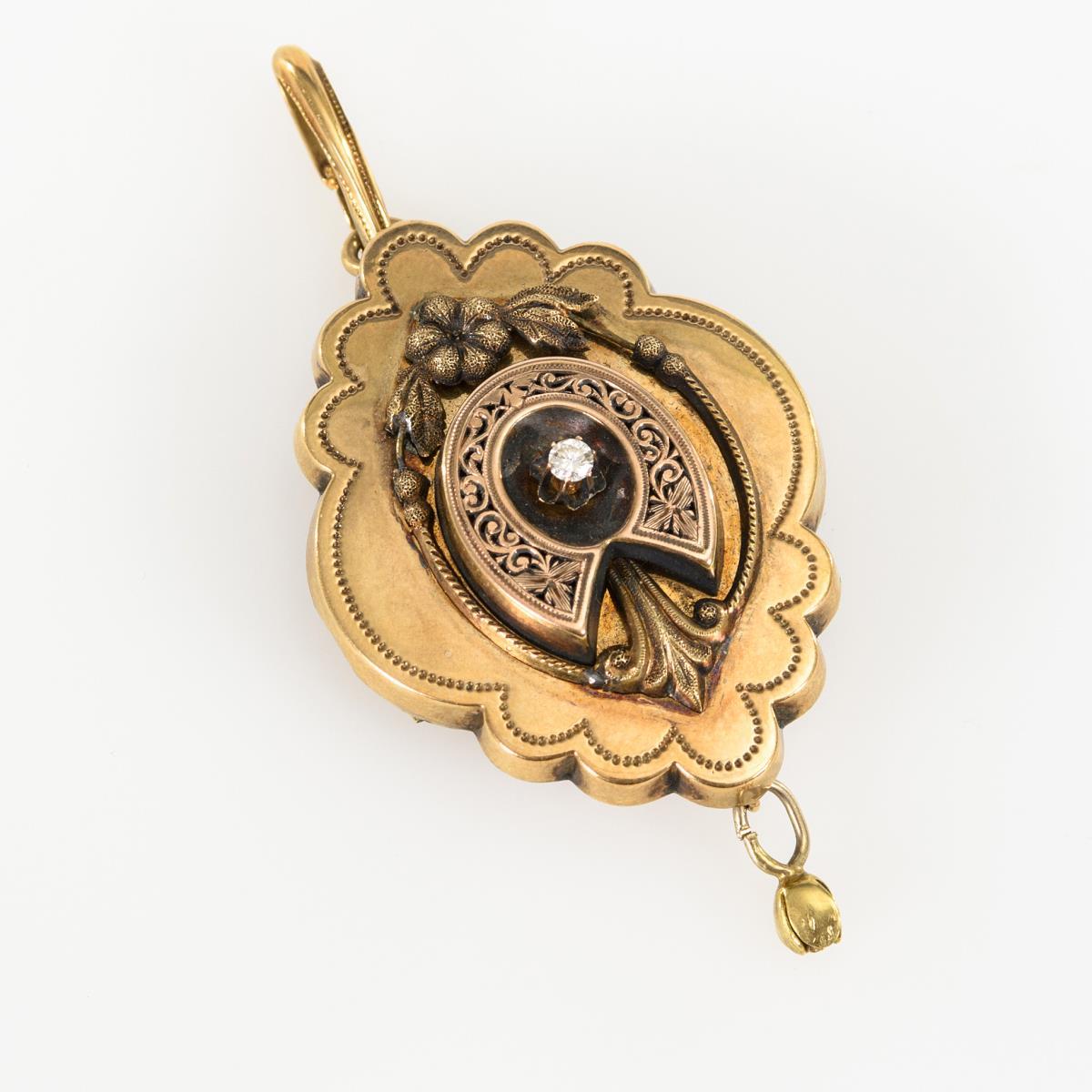 585 GG geprüft. Ovales mehrpassiges, verziertes Medaillon mit chatongefasstem Brillant und kleiner Abhängung. Rückseitig gerahmt verglastes Fach, Scharnieröse und Hakenverschluss. 5 x 3 cm..
