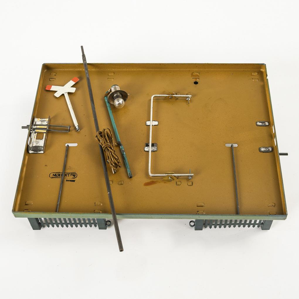 Gauge 0. Gated level crossing with intact mechanism for closing the barriers. Including St. Andrew's cross and street lamp. In original? box with dealer's label "E.F. Büchi Söhne, Bern". Minimal paint defects.