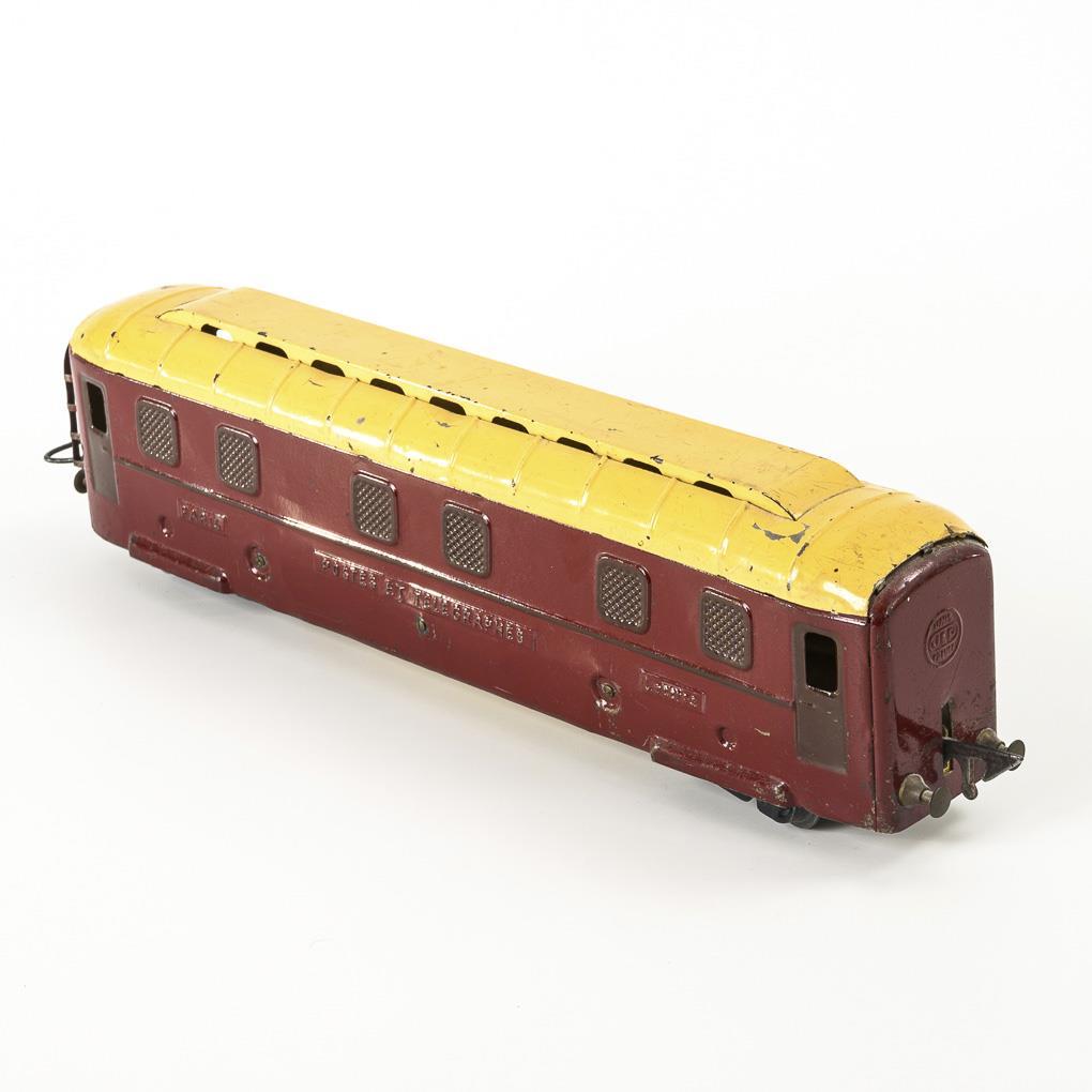 0-gauge. Old pack wagon with living and 2 transport containers, marked JdeP. L 25.5 cm. / Red-brown mail wagon with white roof "Paris - Postes et Telegraphes - Lettres", marked JEP. L 36.5 cm. Worn, paint defects.