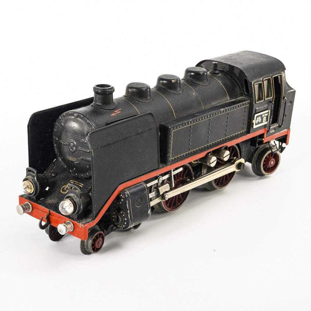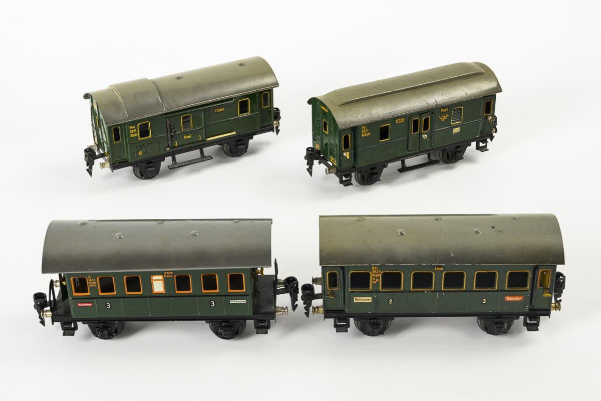 Black locomotive "12920" (1B2, 20 volts), length 26 cm. 3 baggage cars: rare baggage car "Post 17330" and 2 cars with sliding doors "18080" and "17280") and 4 passenger cars, each approx. 18.5 cm long. Worn, function not tested.