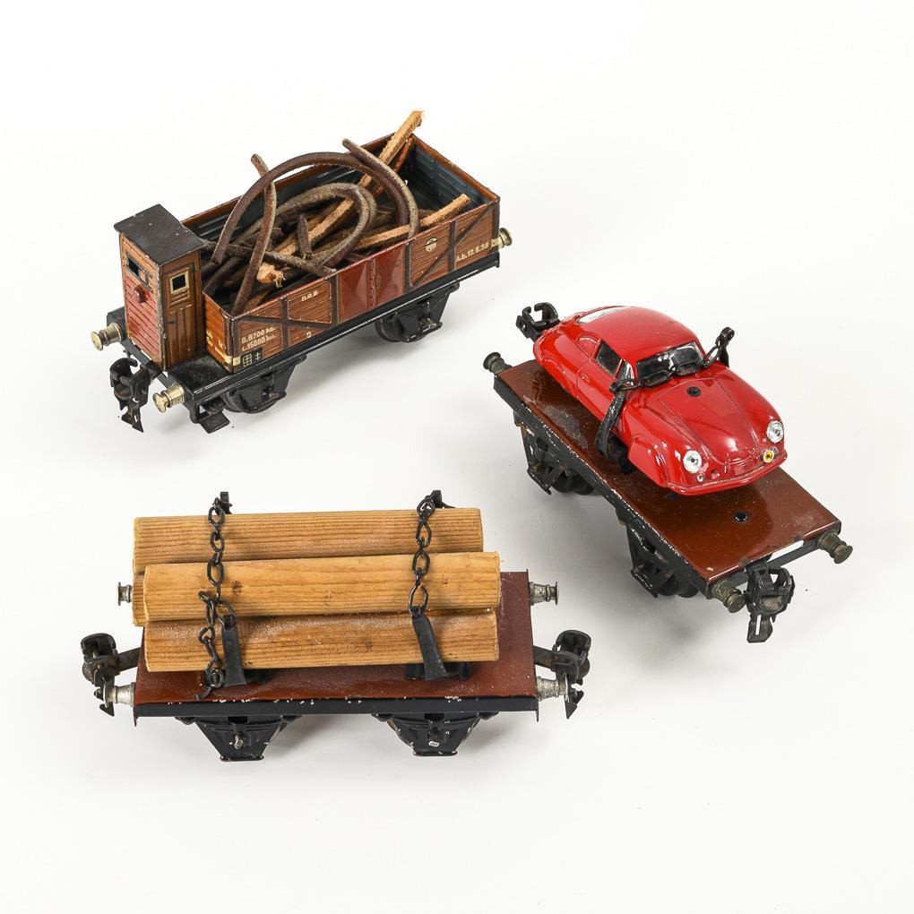 Rare car transport trolley with magnet, loaded with red Porsche. L 13 cm. Flat freight wagon, loaded with wood. L 13 cm. Open boxcar with brakeman's cab, loaded with leather strips. L 14.5 cm. Worn, paint defects.