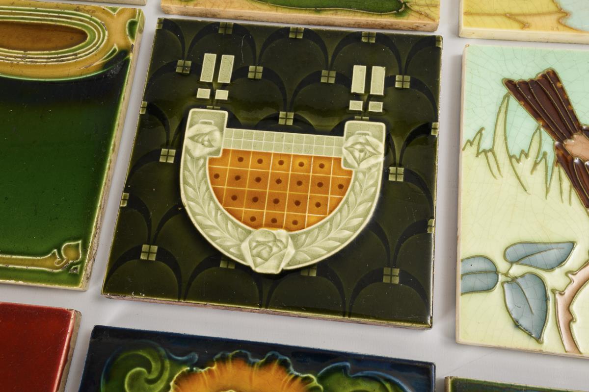 42 tiles with predominantly thread relief decoration, various floral motifs, some represented several times, 3x birds, 1x a coherent ornamental motif. Partly with added suspension. Slight signs of age and wear, minor defects in places.
