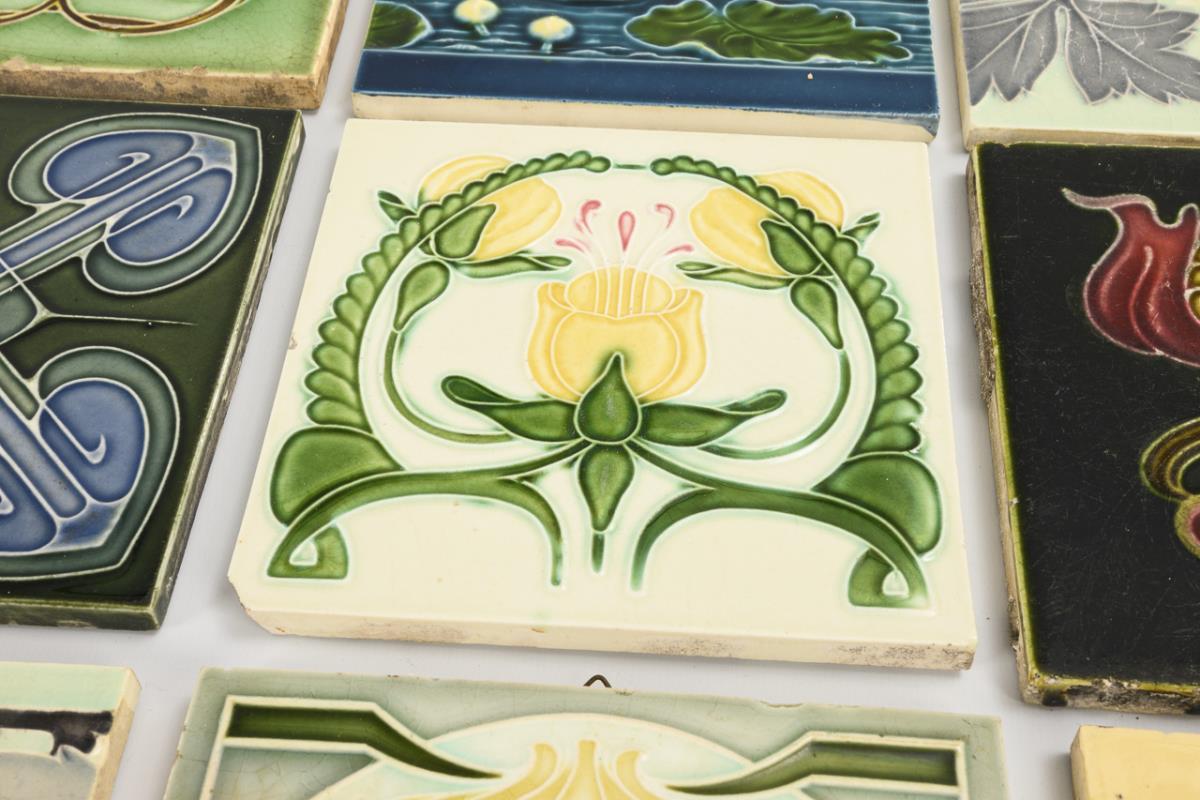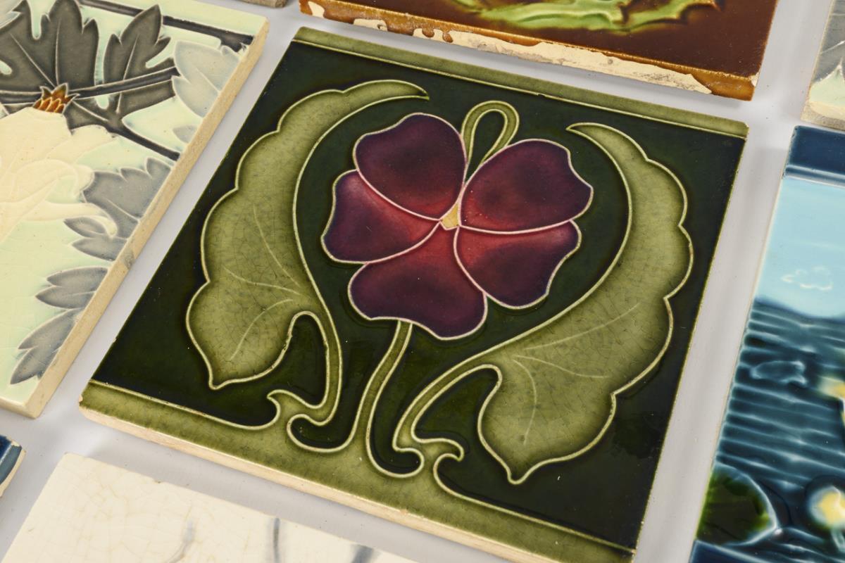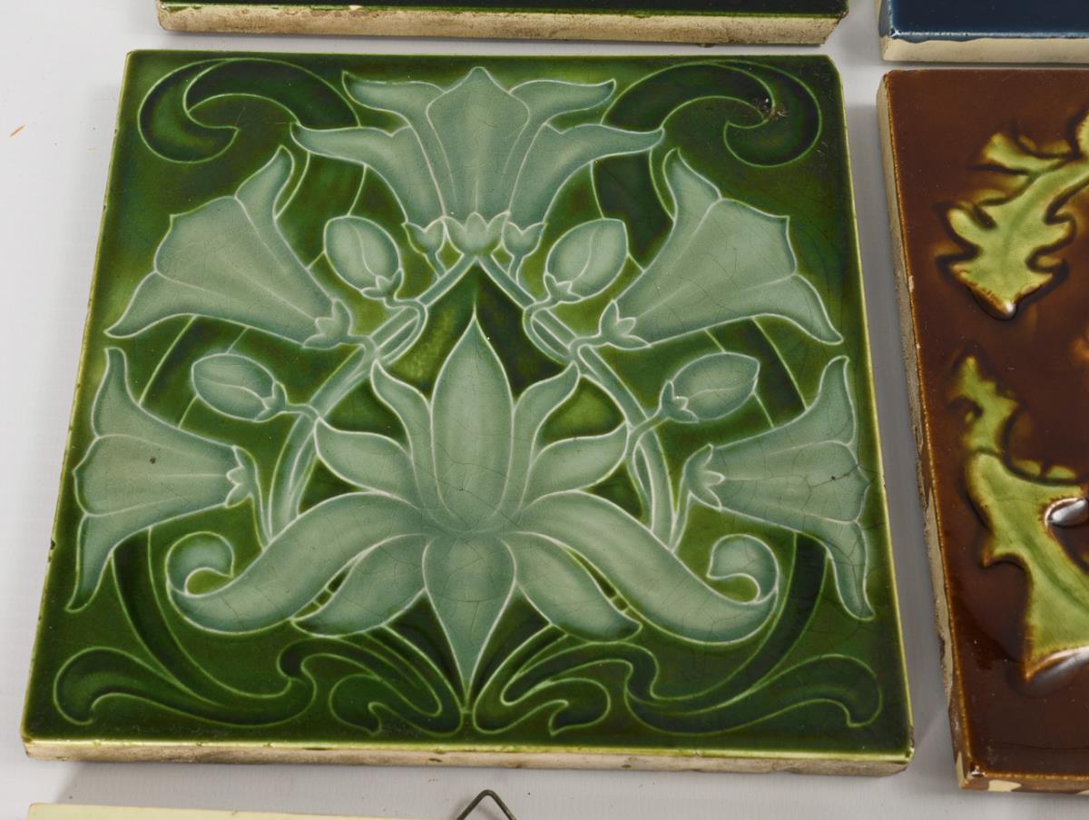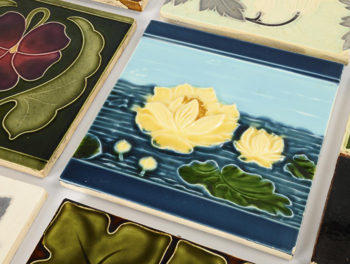 37+5 tiles with predominantly thread relief decoration, various floral motifs, some represented several times, 1x with sheep's head. Partly with supplemented suspension. Slight signs of age and wear, minor defects in places.