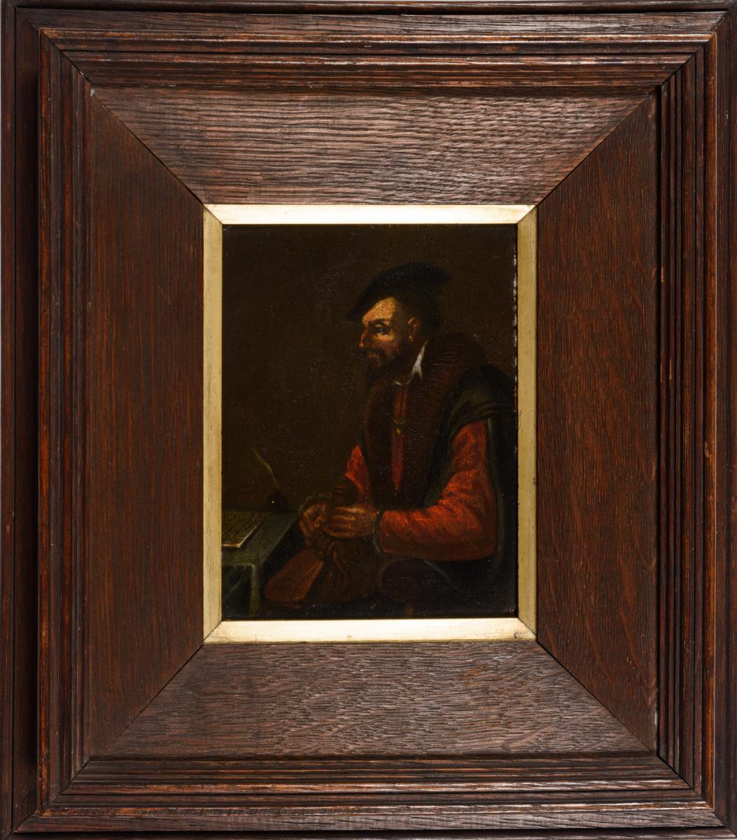 Mann in Kleidung eines Wohlhabenden des 16. Jahrhunderts am Schreibtisch.