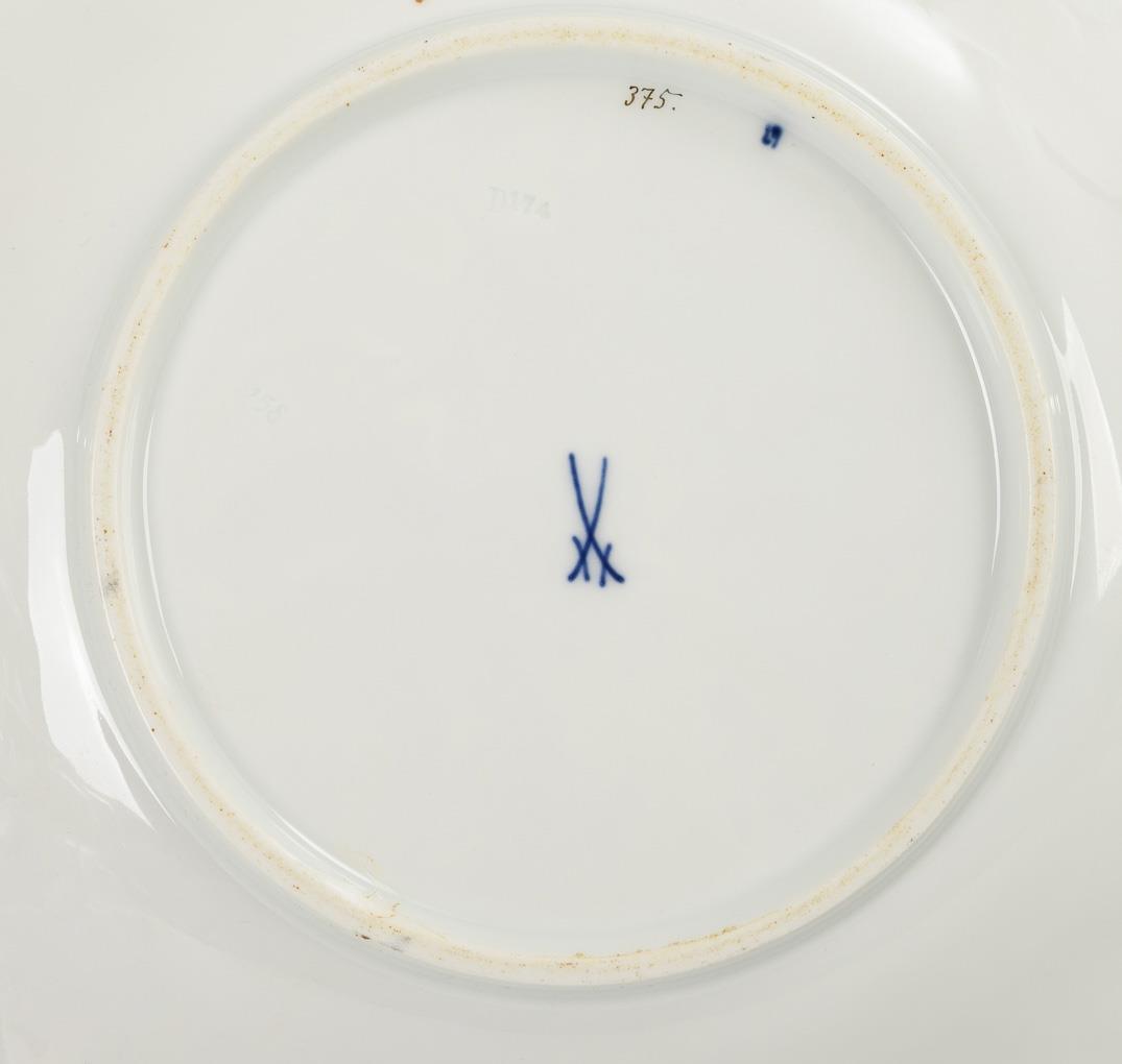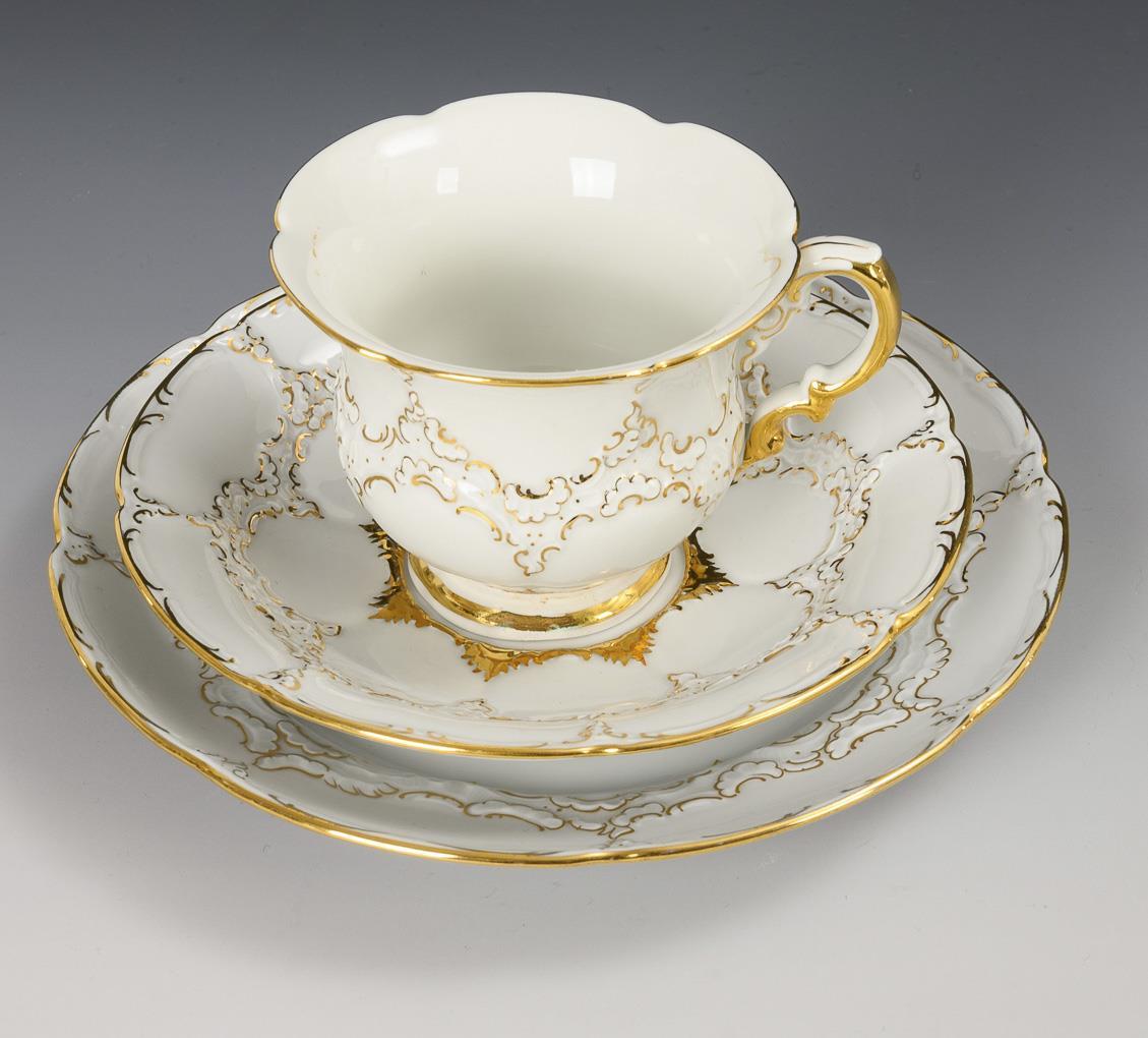 1x plate with partly gold-bronzed oak leaf relief (Ø 28 cm). / 1x place setting "B-shape": Coffee cup (H 8 cm), saucer and breakfast plate (Ø 20 cm).