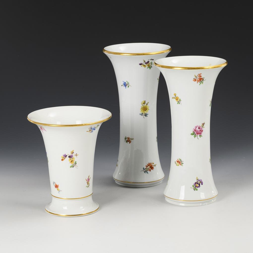 2 flute vases and 1 krater vase with scattered flower painting. Meissen.