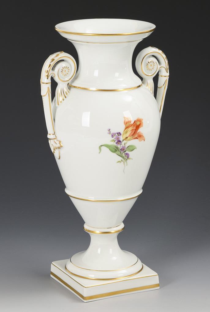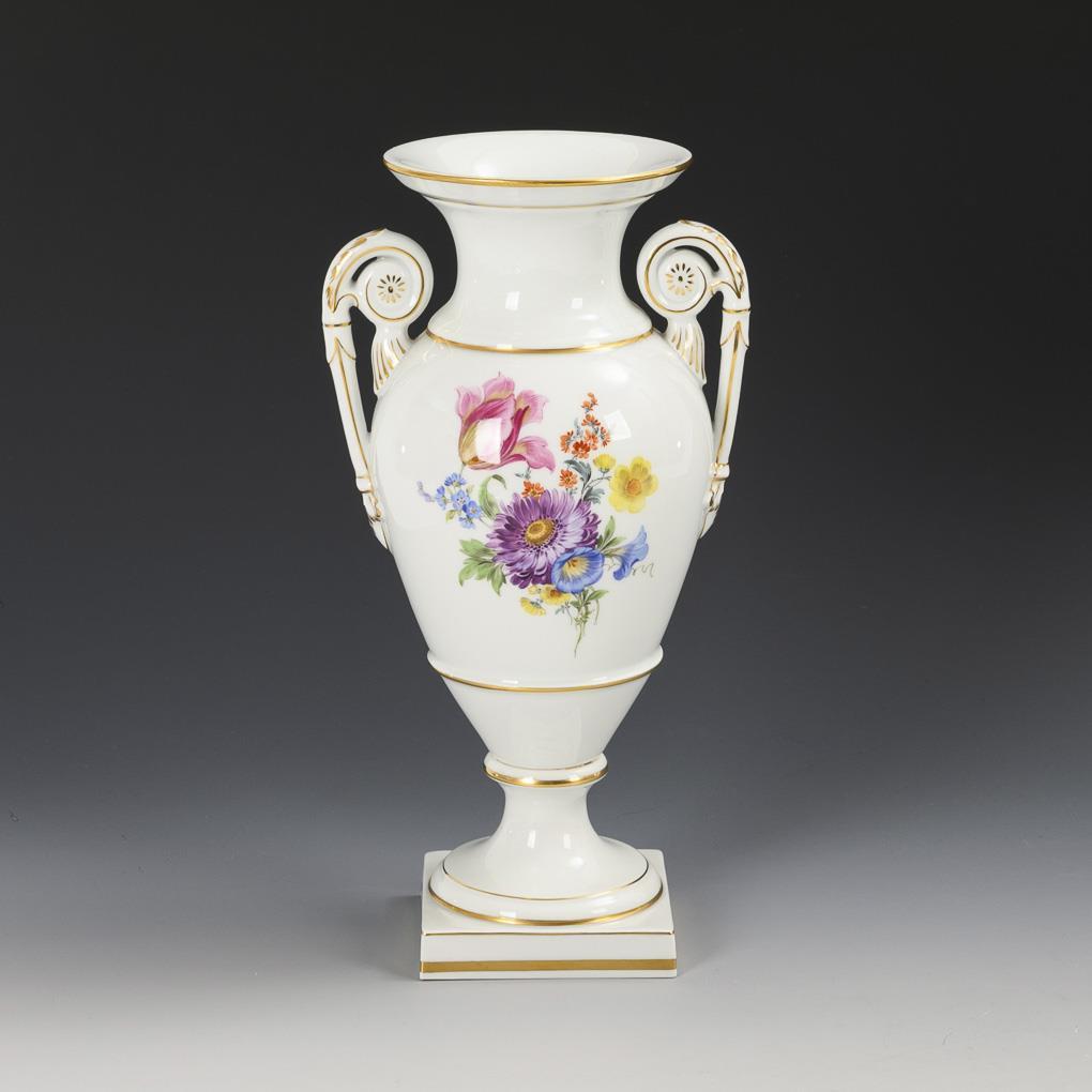 Amphora vase with rosette handles, crater neck, round foot and square plinth. On the front a bouquet of flowers with tulip, bindweed and aster.