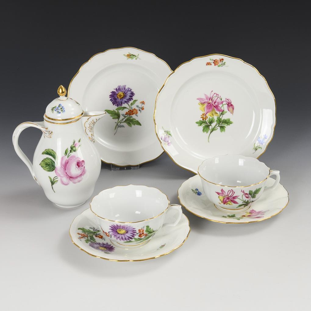2 place settings, shape "Neuer Ausschnitt": 2 teacups, 2 saucers and 2 cake plates (Ø 17.5 cm). / 1 mocha pot (h 16.5 cm)
