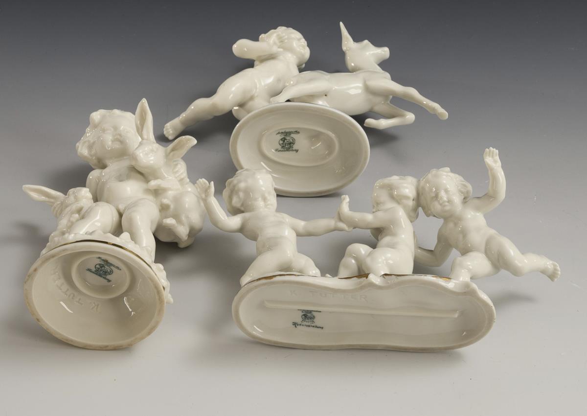 1x Putto with two hares (H 19 cm). / 1x putto with fawn (H 17 cm). / 1x three dancing putti (H 11.5 cm). 1x gold retouched.