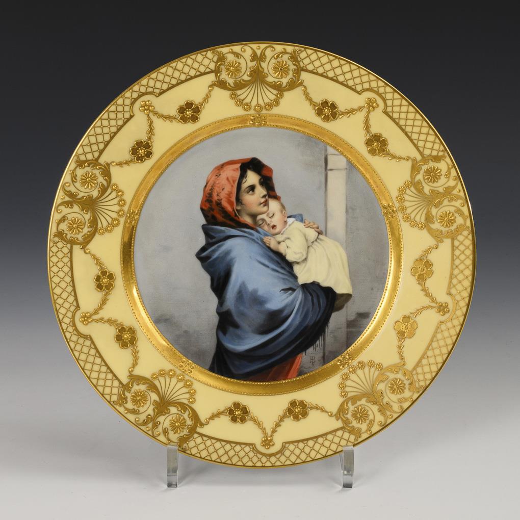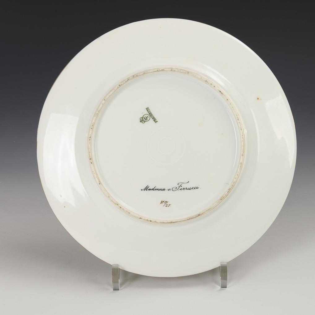 Plate with a yellow, richly relief-gilded flag base, in the mirror the depiction of a young mother carrying her child in her arms, after a painting by the painter Roberto Feruzzi (1853-1934), inscribed on the underside "Madonna v. Ferucci.".