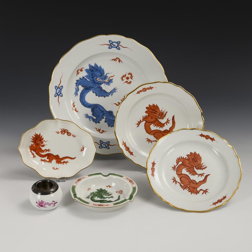 4x "New cut-out" mold: "Mingdrache" dinner plate in blue (Ø 25 cm), 2 "Mingdrache" cake plates in red (Ø 17.5 cm) and 1 "Mingdrache" quatrefoil bowl (L 15.5 cm) in red / 1 "Mingdrache" round ashtray in green (Ø 12.5 cm). / 1 "Mingdrache" matchbox in purple with silver mounting (H 4.5 cm).