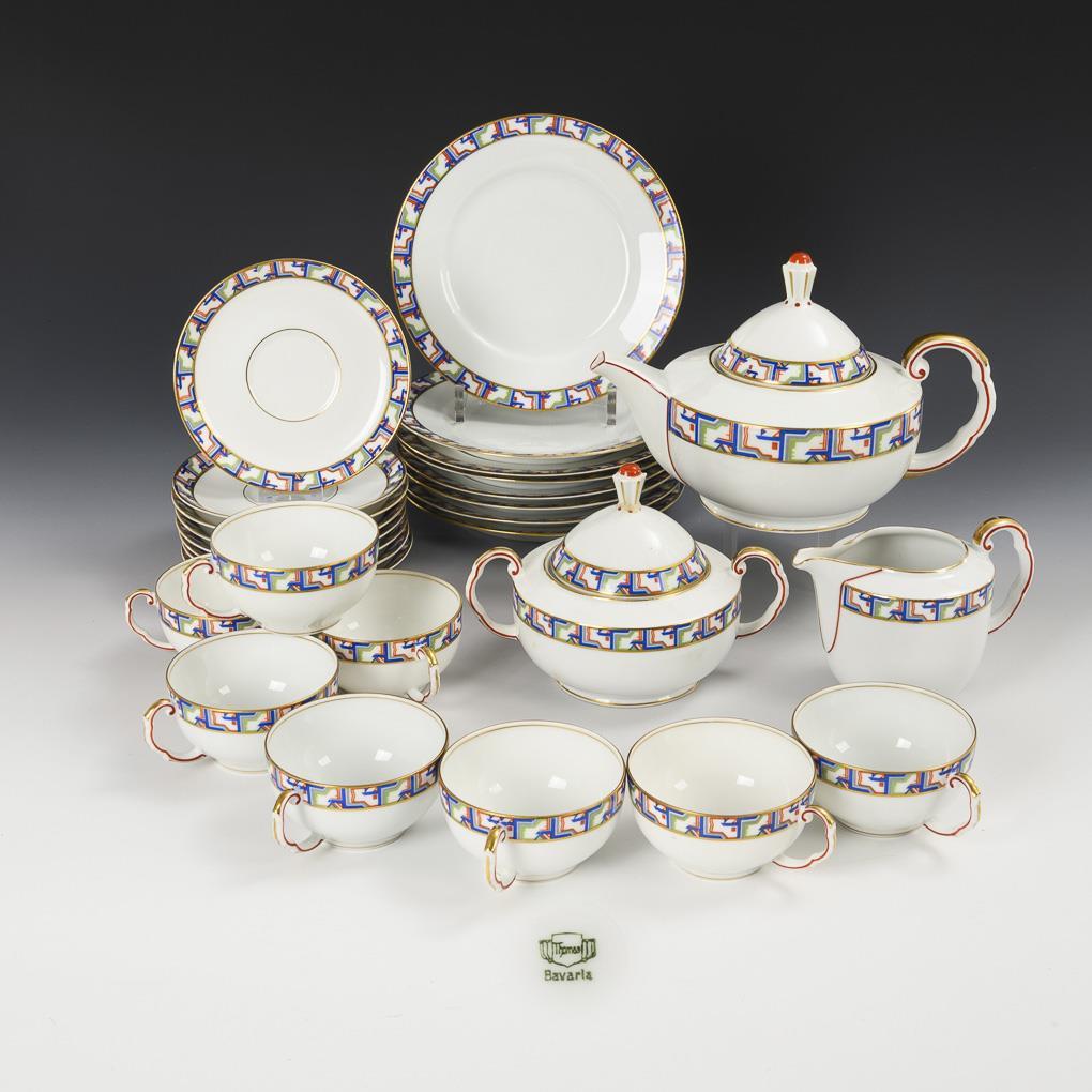 27 pieces. Bellied vessel forms with a geometric border and gold decoration. Teapot (h 15.5 cm), milk jug, sugar bowl, 8 teacups, 8 saucers and 8 breakfast plates. Sugar bowl knob glued, chips to 1 edge of the plate and to the edge of the milk jug.