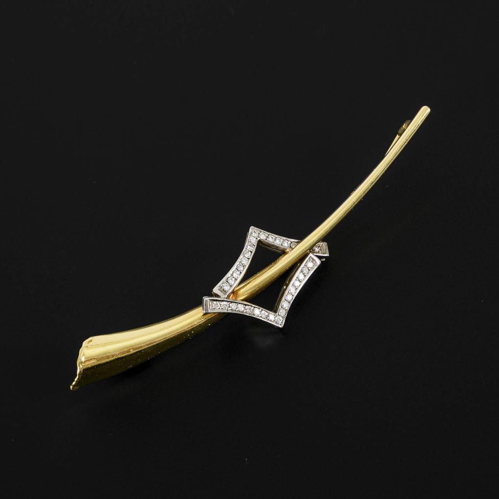Marked yellow gold/white gold 585. Diamonds totaling 0.37 ct. Brooch 8.6 x 0.9 cm. 9,4 g.