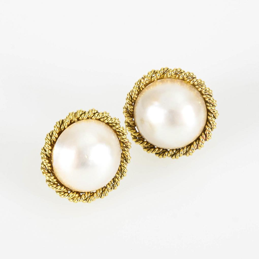 Marked 585 yellow gold setting. Ø cultured shell pearl 1.2 cm. Stud earrings Ø1.7 cm. 7,1 g.