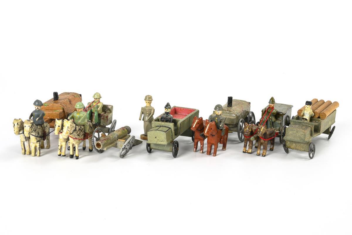 6 vehicles (4 horse-drawn carriages and 2 transporters) and 1 cannon with soldier. Parts with small color defects.