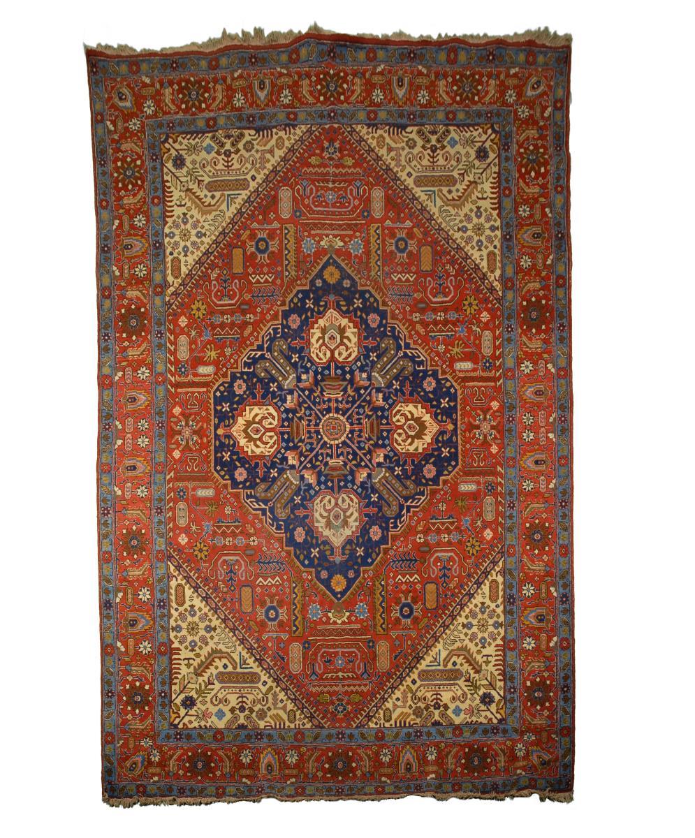 Großer Orientteppich mit geometrischem Dekor. Nordwestpersien, um 1900. Wolle, handgeknüpft. Polychromdekor mit vorwiegend Rot- und Blautönen sowie Elfenbein. Bleiplombe. 275 x 385 cm. Geometrisch stilisiert durchgemusterter Teppich mit großem Sechseckmedaillon und Kreuzblüte im Zentrum, hakenbesetzte Füllornamente und kleine Balken. Dreireihige Bordüre mit Blüten und Palmetten. Alters-/Gebrauchsspuren, defekte Fransenabschlüsse. n Provenienz: Aus dem Sammlungsbestand eines hessischen Industriellenhaushalts. ABB.B 404 UG akzeptiert. 18.11.19 Annett, aber Kunde zurückgetreten, Conny 275 x 385 cm ///Orient|Teppich Teppich, TK 4x4, blauer Schuss, doppelschüssig.