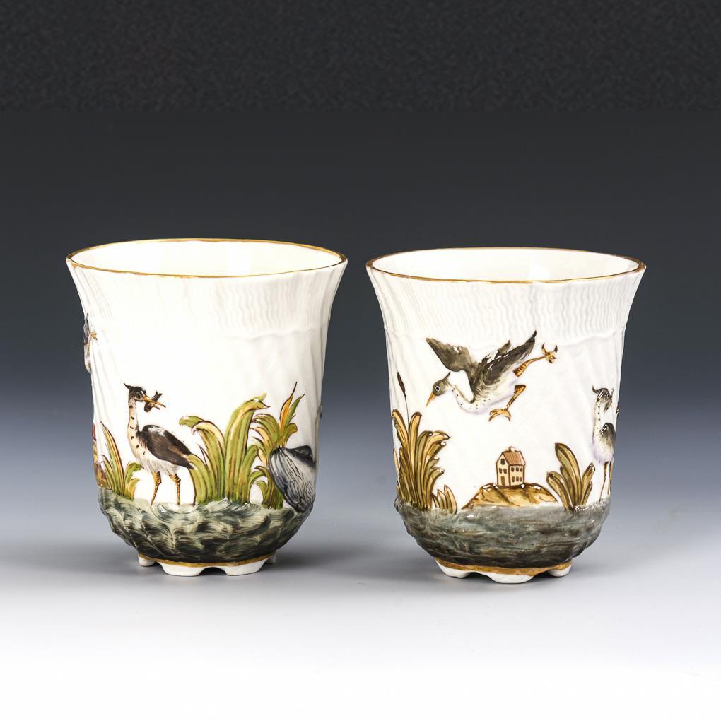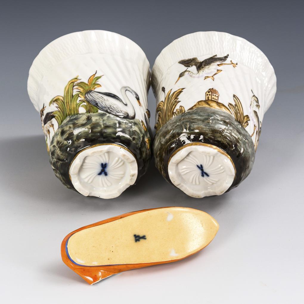 2x crossed line mark, 2nd half of the 19th century: Mug with a relief of a pond landscape with swans and herons (h 9.5 cm). / 1x Meissen, from 1850-1918: small porcelain slipper (L 10 cm). Minimal wear and rubbing to the rim of the slipper.