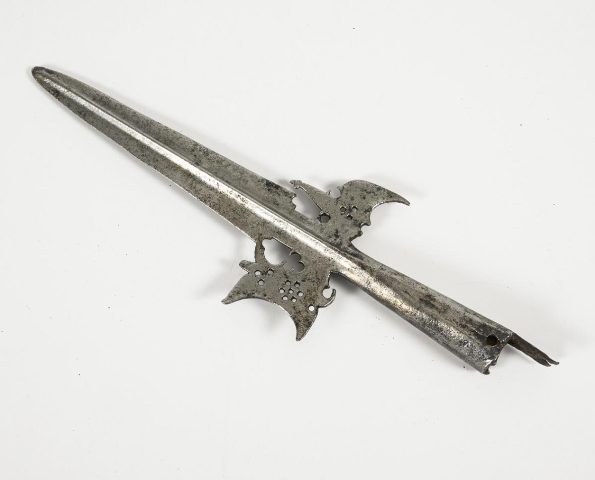 Blade and socket forged from one piece. Lance part with central ridge, wing parts with perforated pattern. Extension for shaft attachment broken off. Corrosion scars.